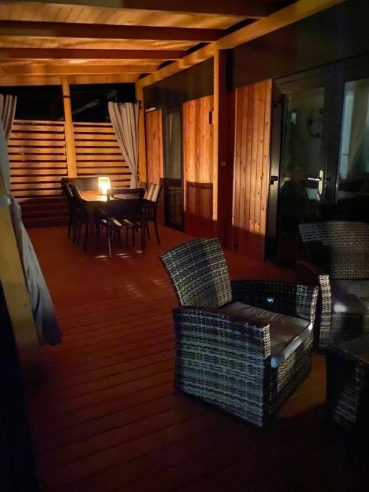 Kućica se sastoji od 2 spavaće sobe ( bračni krevet + 3 pojedinačna kreveta), 2 kupaonice sa tuš kabinama,dnevni dio+ kuhinja,i velike natkrivene terase(24m2) od punog drva na koju se nadovezuje sunčalište sa ležaljkama.