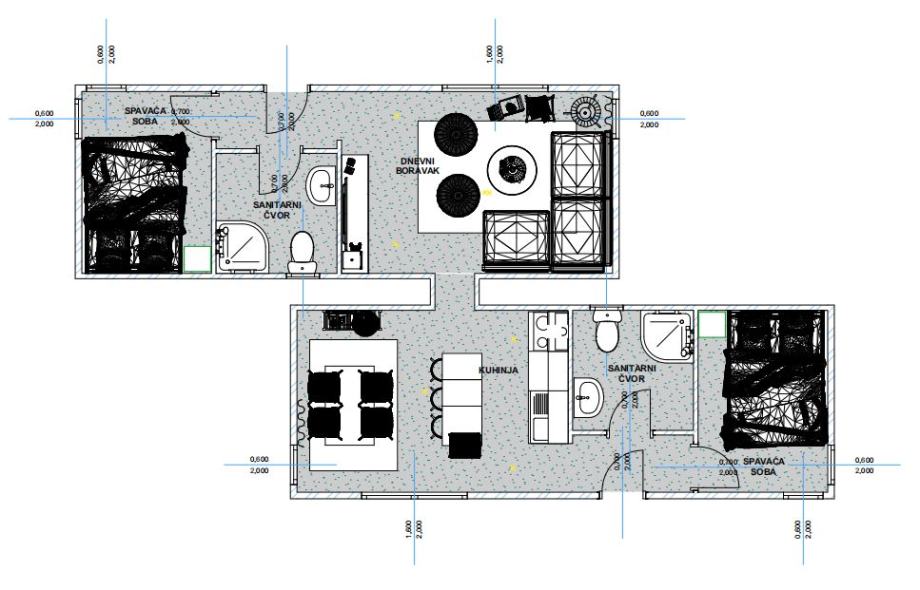 Kućica sadrži dvije spavaće sobe, dvije kupaonice, kuhinju i dnevni boravak (mogućnost odabira jedne kupaonice).