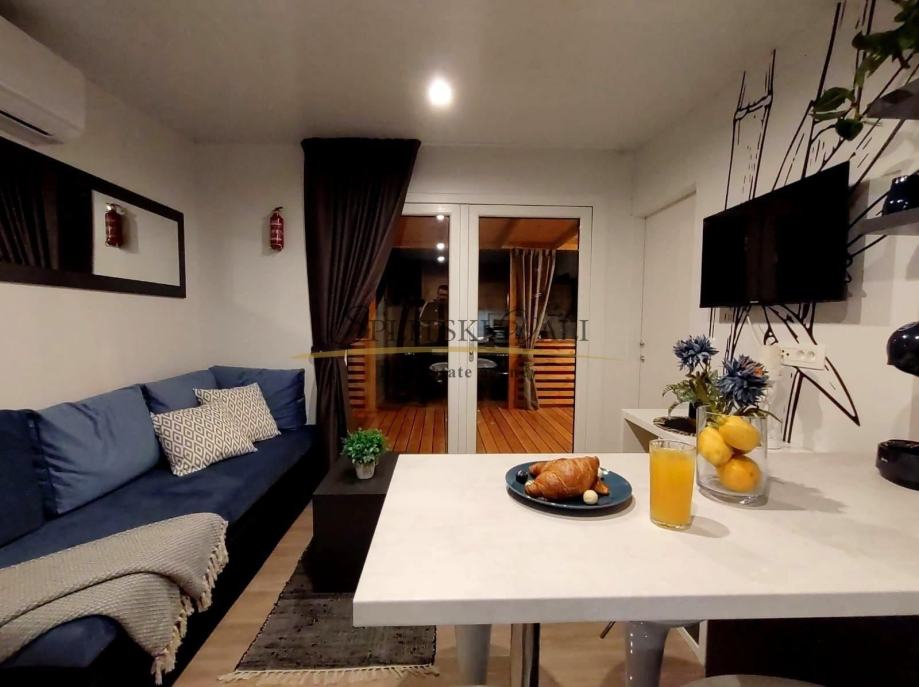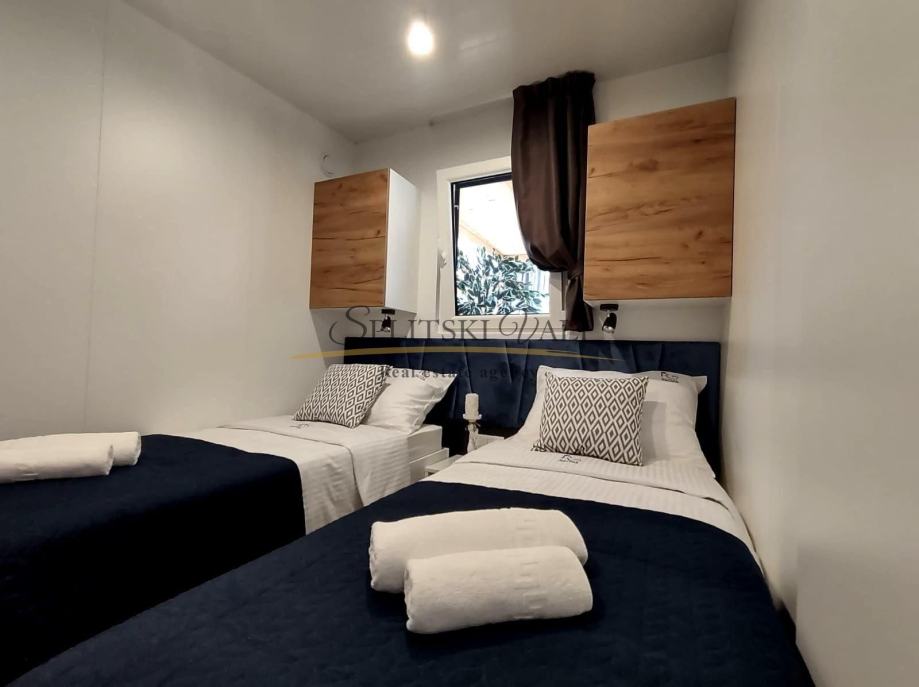 Kućica je opremljena svim kućanskim električnim i ostalim aparatima, novom posteljinom, ručnicima i posuđem, odnosno svime po 3 garniture što je dovoljno za 6 osoba. Full namještena i takva se i prodaje, bez dodatnog ulaganja.