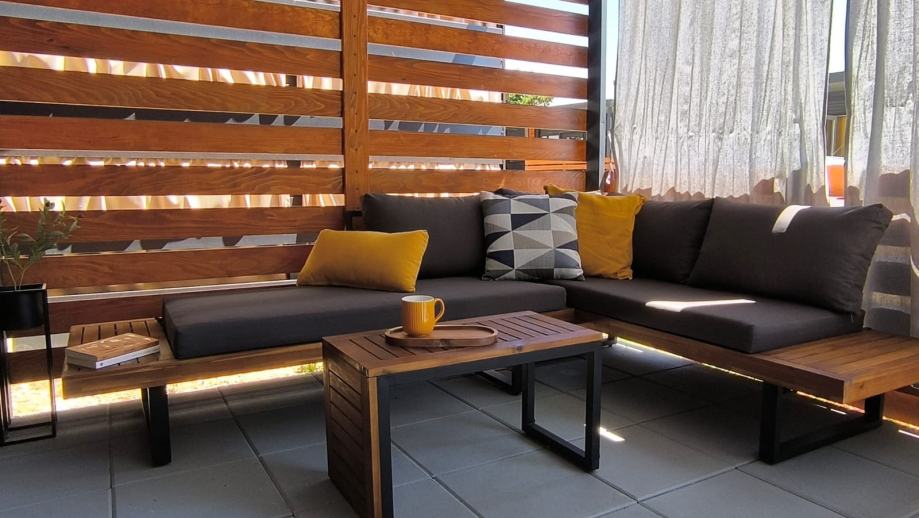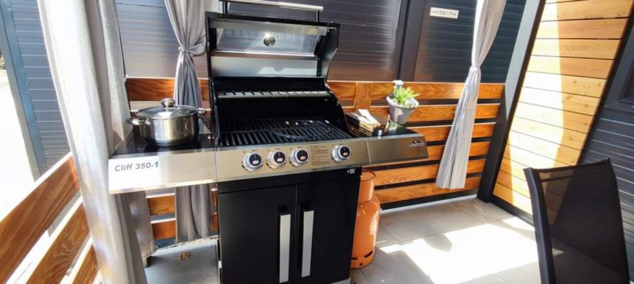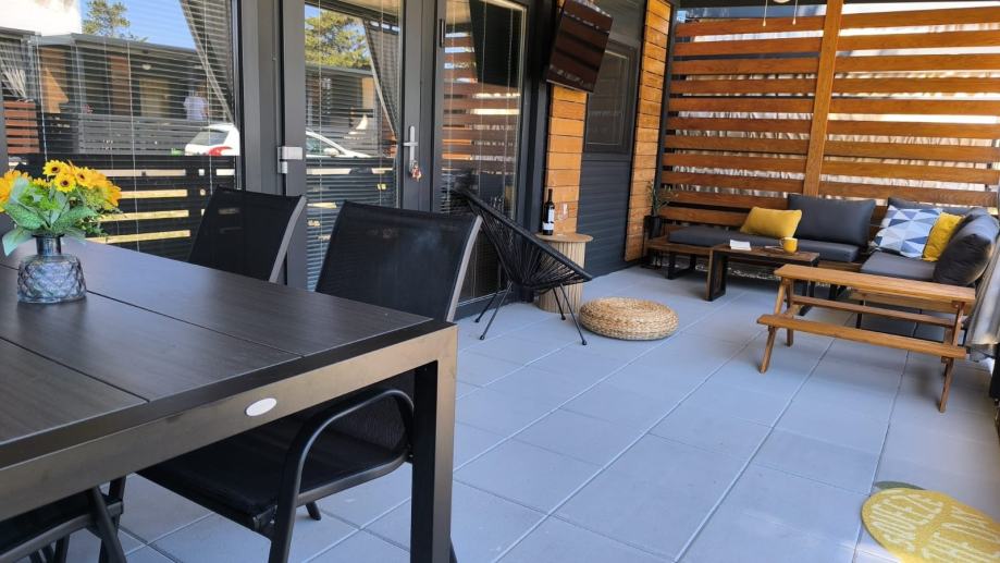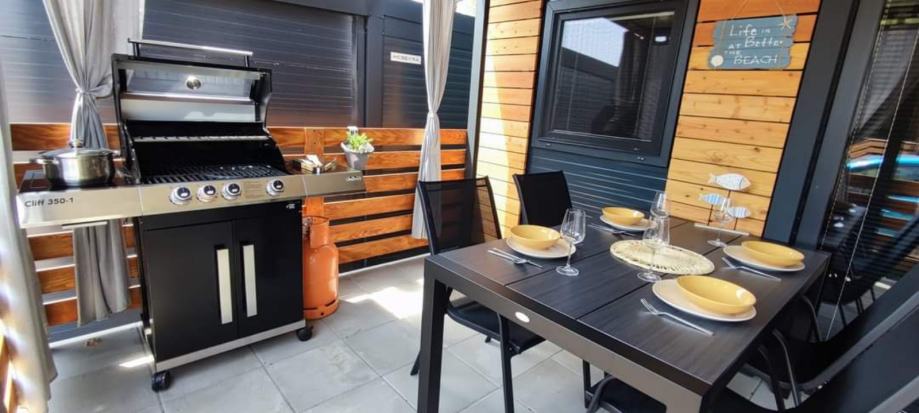 kuhinja s blagovaonicom i dnevnim boravkom, velika terasa ( 24m2) s lounge garniturom, stolom za 6 osoba, ležaljkom i velikim plinskim roštiljem.