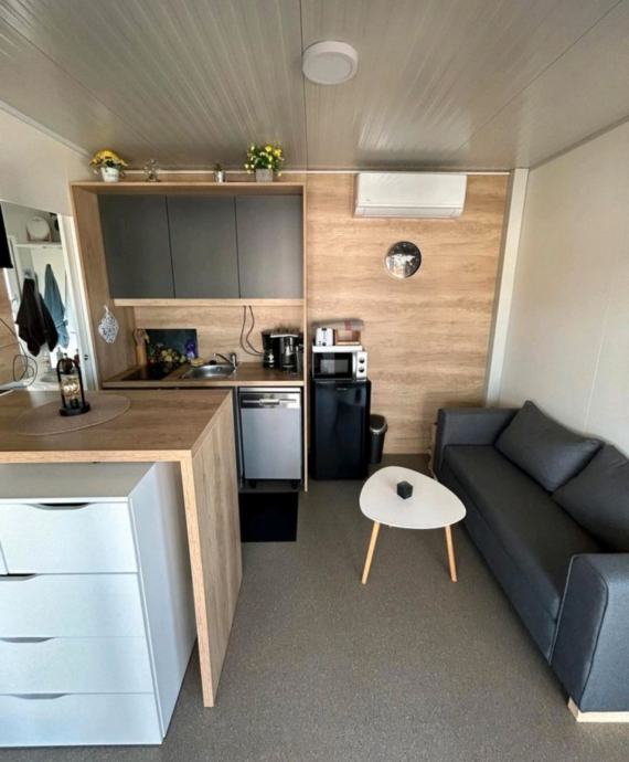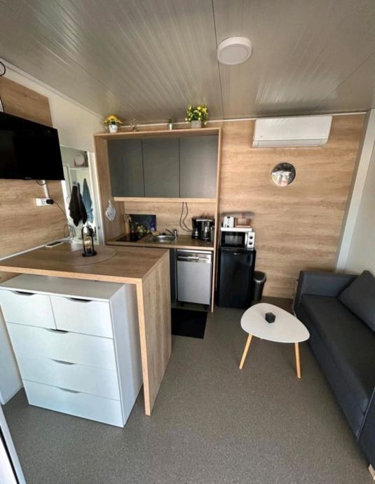 Kućica ima 2 spavače sobe, sa bračnim krevetom, kuhinja/blagovaonica/dnevni boravak gdje se nalazi dvosjed na razvlačenje, te potpuno opremljena kuhinja sa svim posuđem, tuš kabina i wc.