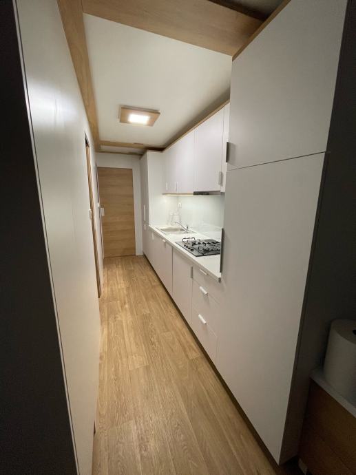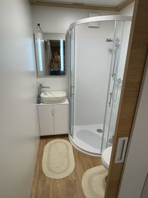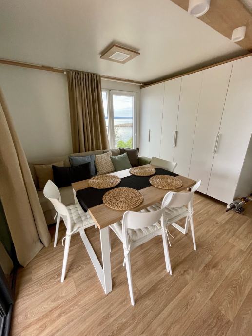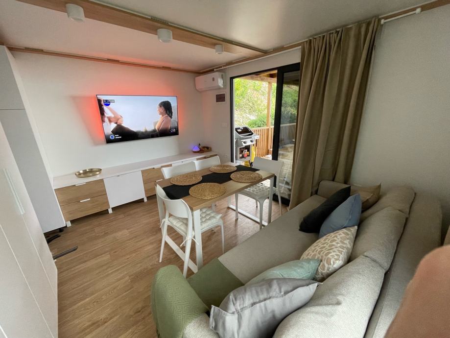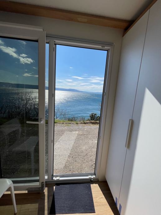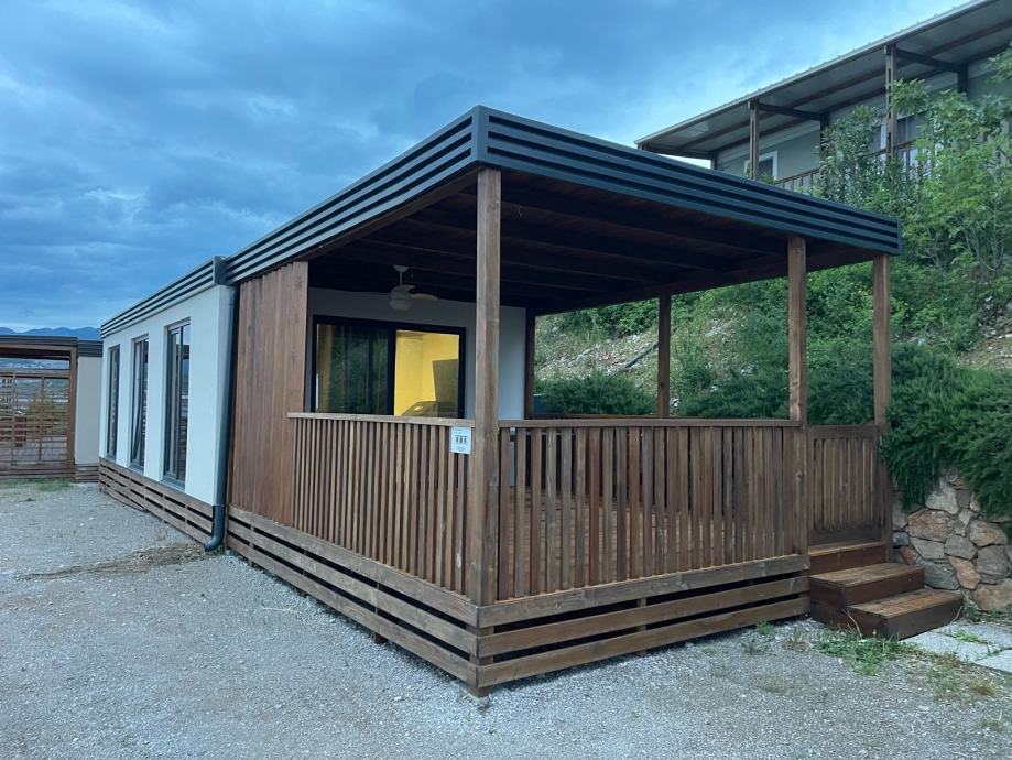 Prodaje se moderna, izrađena po mjeri i nadstandardno opremljena mobilna kućica smještena u uređenom kampu u Klenovici, na mirnoj premium lokaciji s otvorenim pogledom na more.