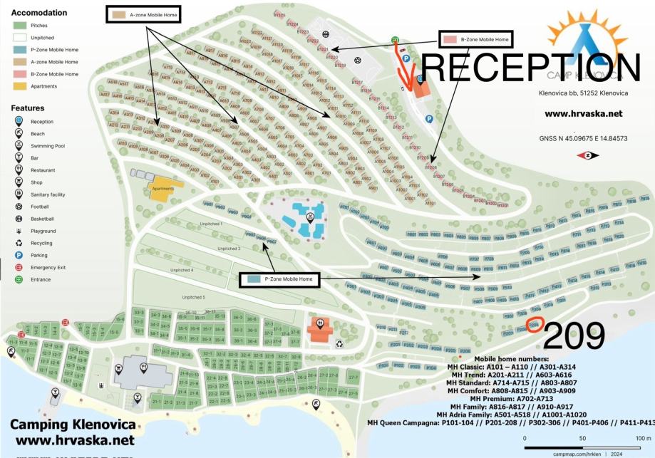 Mobilna kućica nalazi se na uređenoj kamp parceli do 80 m² (zakup), u kvalitetnom i mirnom dijelu kampa. Parkiralište za 2 auta.
