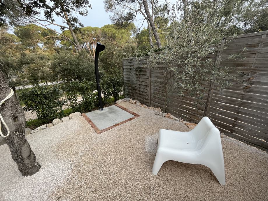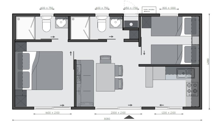 The house has an area of 33.21 m2 with a large terrace (ceramic tiles) extended to a sunbathing area (larch). The house consists of two bedrooms (one with a double bed and the other with two single beds), two bathrooms, a living room with a pull-out bed. The house is rented for 4+1 persons.