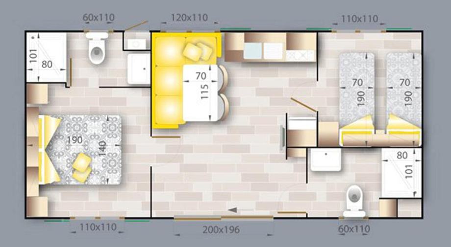 Kućica je površine 33,21m2 sa velikom terasom (keramičke pločice) proširenom na sunčalište (ariš). Kućica se sastoji od dvije spavače sobe (jedna sa bračnim krevetom, a druga s dva odvojena kreveta), dva kupatila, dnevnog boravka s krevetom na razvlačenje. Kućica je iznajmljivana za 4+1 osobe.