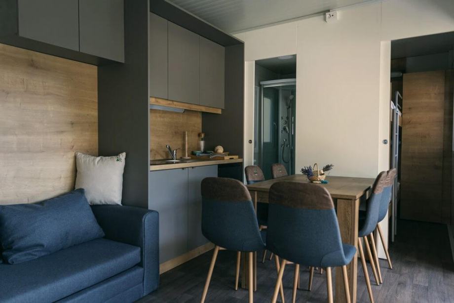 Predstavljamo vam naše jedinstvene mobilne kuće za šest osoba, koje spajaju udobnost i funkcionalnost. Dvije ugodne spavaće sobe, kupaonica i prostrani dnevni boravak s kaučem na razvlačenje osiguravaju udoban odmor za cijelu obitelj ili grupu prijatelja. Ali to nije sve. Želimo da se osjećate kao kod kuće, pa su sve naše kuće opremljene klima uređajem koji pruža ugodan hlad tijekom vrućih ljetnih dana. Ujutro možete uživati u prvim zrakama sunca na prostranoj terasi, a navečer diviti se zalasku sunca dok se opuštate nakon dana punog avantura.