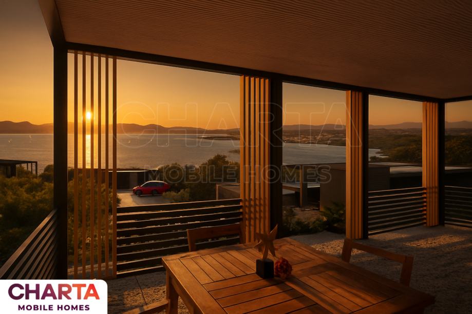 Mobilne kućice u 𝗸𝗮𝗺𝗽𝘂 𝗦𝗮𝗻𝗻𝘆 biti će okrenute terasom prema moru što im daje jedinstven pogledtijekom cijelog dana. Svakog dana kroz čitavu godinu.