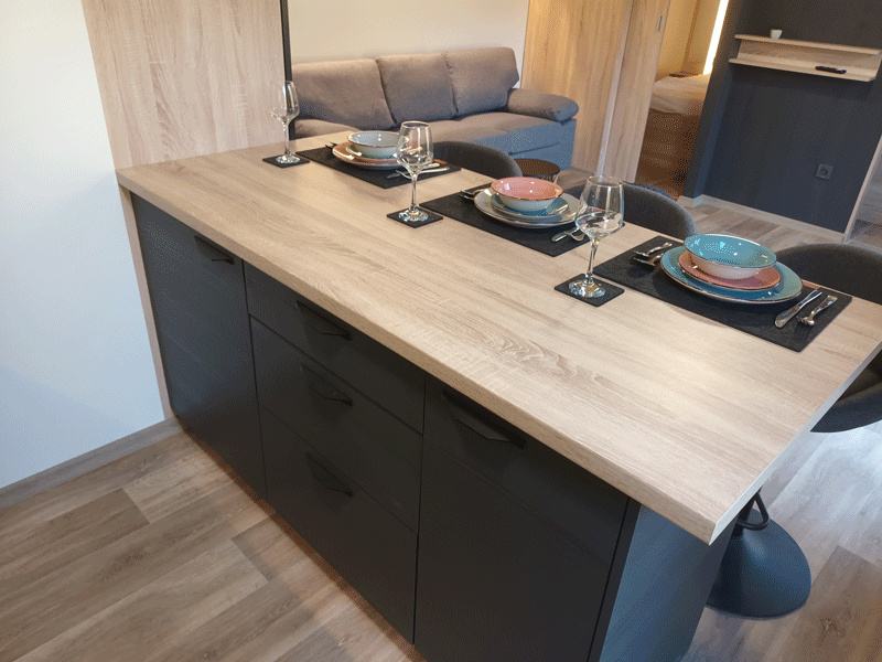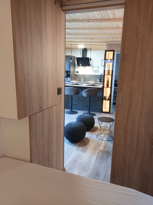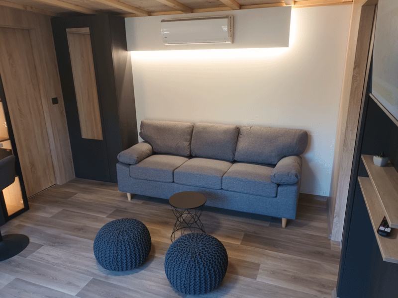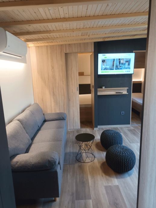 Dnevni boravak - 3 barske stolice, polica, smart televizor 40 incha - lcd, klima uređaj, trosjed, 2x tabure, klub stolić