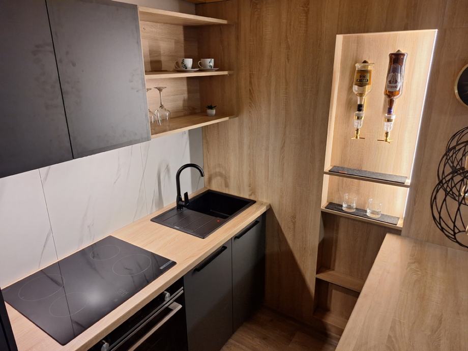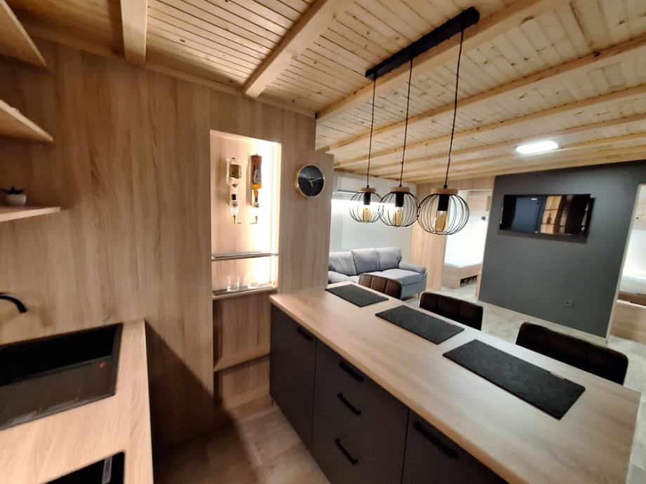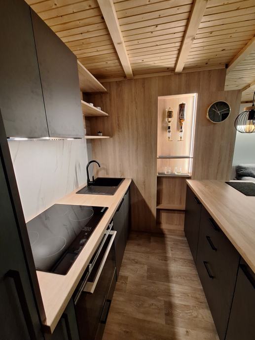 Kuhinja - Kuhinjski elementi oplemenjena iverica 18 mm, El. aparati: el. ploča za kuhanje, sudoper sa slavinom, Hladnjak sa zamrzivačem, napa, perilica suđa, pečnica, staklena vitrina.