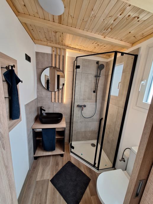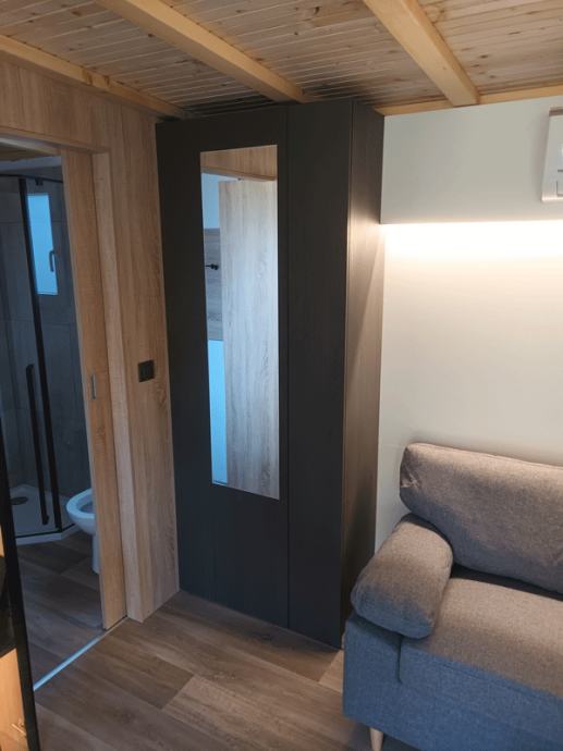 Kupaonica - Tuš kabina, umivaonik sa slavinom, wc školjka-monoblok, ormarić za stvari, Ormar sa el. Bojlerom 74L i ogledalom.