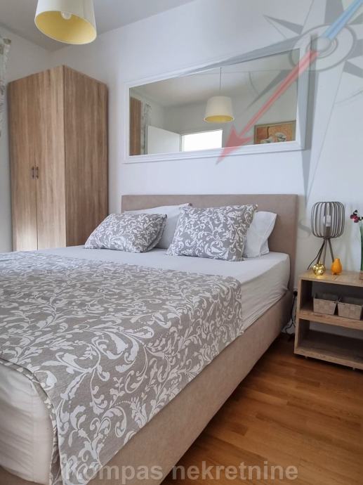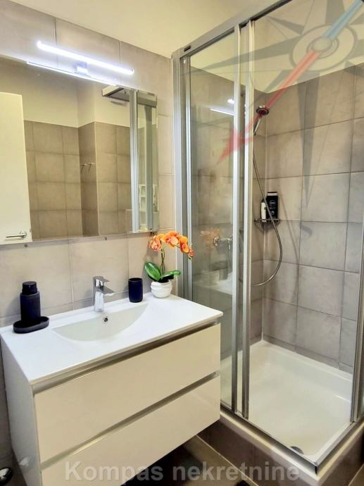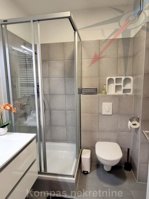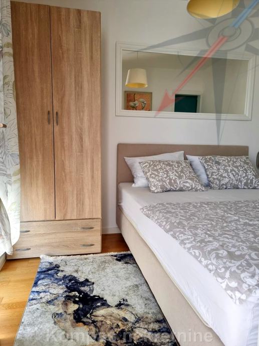 Modernly furnished two-room apartment (48 m2) on the first floor of a residential building with an elevator, Karla Metikoša Street. Consists of an entrance area with built-in wardrobes, a bedroom, a bathroom and a living room connected to the kitchen. The rooms have access to a covered balcony. The apartment has new furnitura, security door, intercom, air conditioning, the possibility of fiber optic internet, heating via the heating plant. Equipped with small appliances, bed linen, towels, robes, cooking and eating utensils. Has a parking space in front of the building, in a parking lot protected by a ramp. Possibility of paying extra for a parking space in the garage of the building. The possibility of a maid, coming weekly or monthly (extra charge). All utilities and internet are paid in a flat amount of 170 euros per month. The apartment is designed for a maximum of two people. The building is anti-seismic, common areas and the yard are under video surveillance.