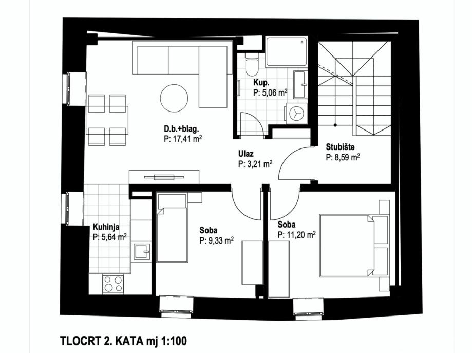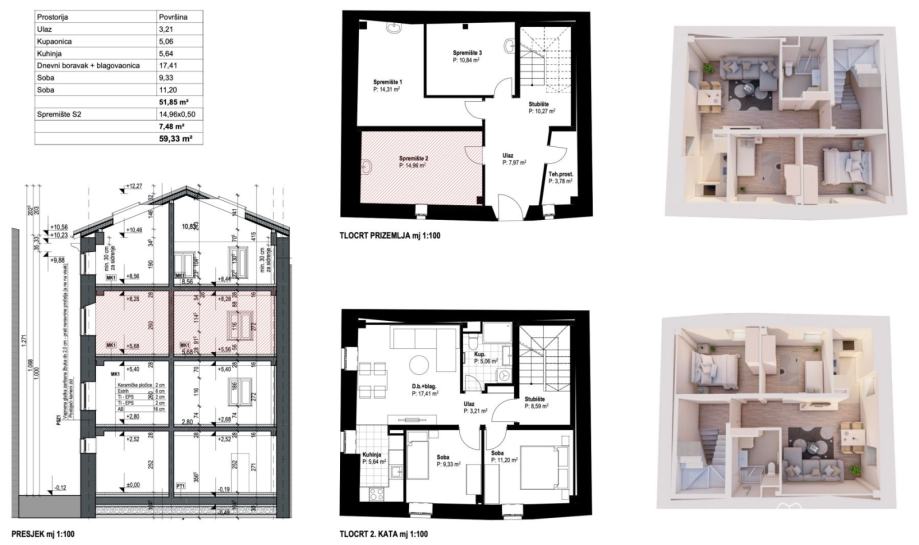 Apartman A-2 – 2. kat – stambena površina 51,85 m2 (2 spavaće sobe + 1 kupaonica) + spremište S2 (14,96 m2); neto obračunska površina 59,33 m2 = 225.454 EUR
