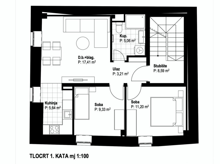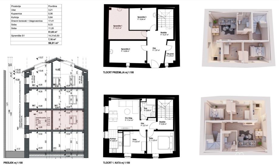 Apartman A-1 – 1. kat – stambena površina 51,85 m2 (2 spavaće sobe + 1 kupaonica) + spremište S1 (14,31 m2); neto obračunska površina 59,01 m2 = 224.238 EUR