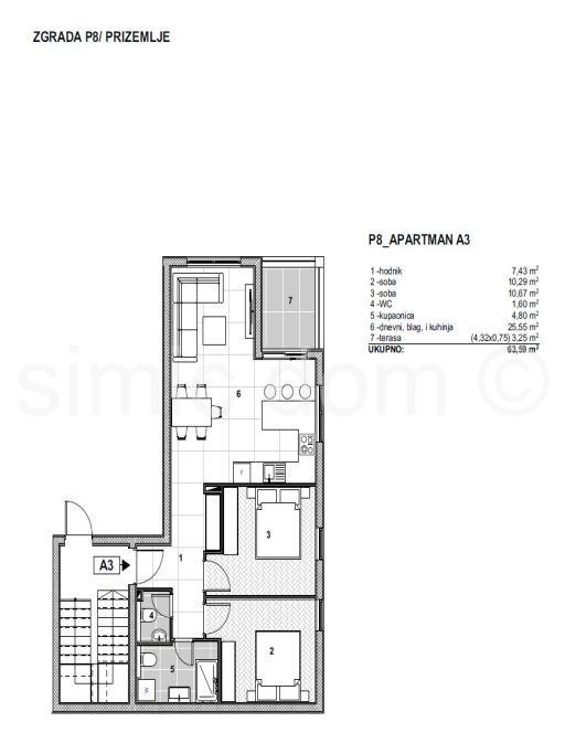 Na prodaju je dvosoban apartman smješten u modernom kompleksu zgrada, svega 150m od plaže na Čiovu. Iz cijelog kompleksa pruža se predivan pogled na more. Apartman A3 nalazi se na prvom katu, neto je korisne površine 63,59 m2, odnosno bruto površine 64,66 m2. Sastoji se od hodnika, dvije spavaće sobe, WC-a, kupaonice, dnevnog boravka, blagovaonice, kuhinje i terase. Stanu pripada jedno vanjsko parkirno mjesto uz mogućnost kupovine dodatnog parkirnog mjesta. Izgradnja i oprema unutar apartmana je izrazito kvalitetnog standarda, a investitor nudi i uslugu opremanja apartmana i unutarnjeg uređenja prema najvišim standardima, s modernim dizajnom koji zadovoljava potrebe kupaca, ali i uslugu rukovođenja najma apartmana. Investiranje s garantiranim povratom predstavlja ključnu prednost ovog projekta. Investitor nudi mogućnost iznajmljivanja kupljenih apartmana u turističke svrhe, preuzimajući kompletan menadžment i usluge gostoprimstva. Na taj način, vlasnicima je osiguran povrat investicije bez potrebe za angažmanom na operativnim poslovima, jer se sve obavlja u njihovo ime, čime im se omogućuje siguran prihod od turističkog najma. Ovakav projekt je jedan od prvih ovog tipa na tom području, a slični koncepti uspješno se primjenjuju širom svijeta te ovo naselje predstavlja jedinstvenu investicijsku priliku na atraktivnoj lokaciji s velikim potencijalom za generiranje prihoda od turističkog najma i dugoročnu vrijednost nekretnine.