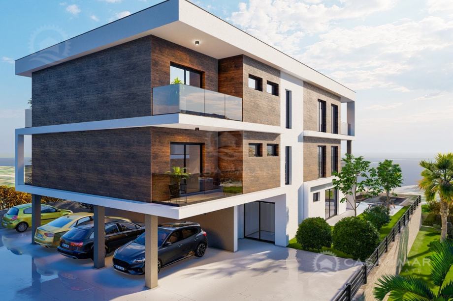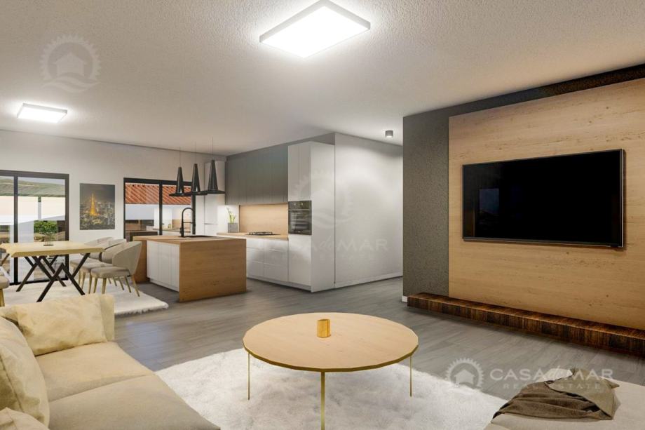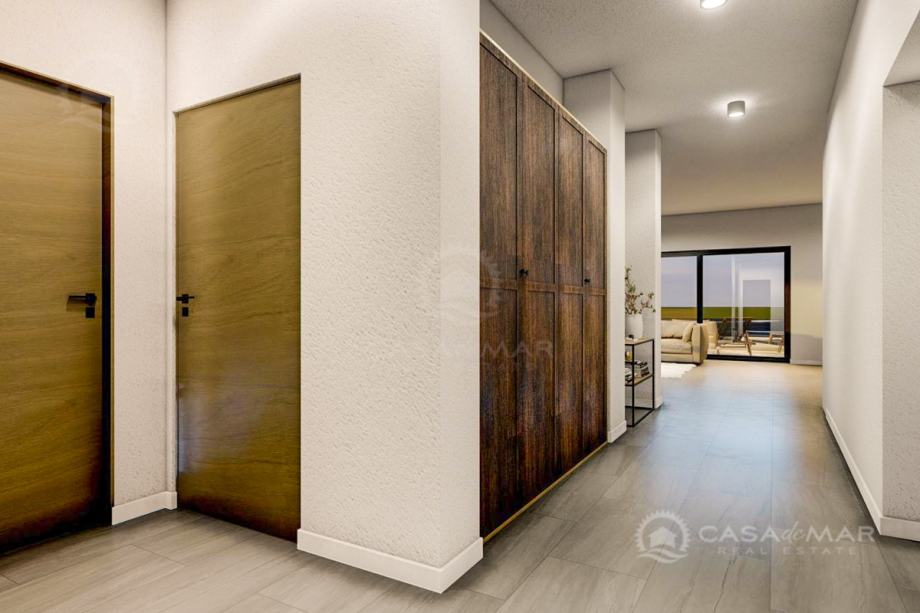 Apartman se nalazi na prvom katu novogradnje i sastoji se od ulaznog prostora, dnevnog boravka sa izlazom na natkrivenu terasu površine 28 m2, kuhinje s blagovaonicom, dvije spavaće sobe, od koji je jedna sa vlastitom kupaonicom, a druga s izlazom na terasu, i jedne zajedničke kupaonice.
