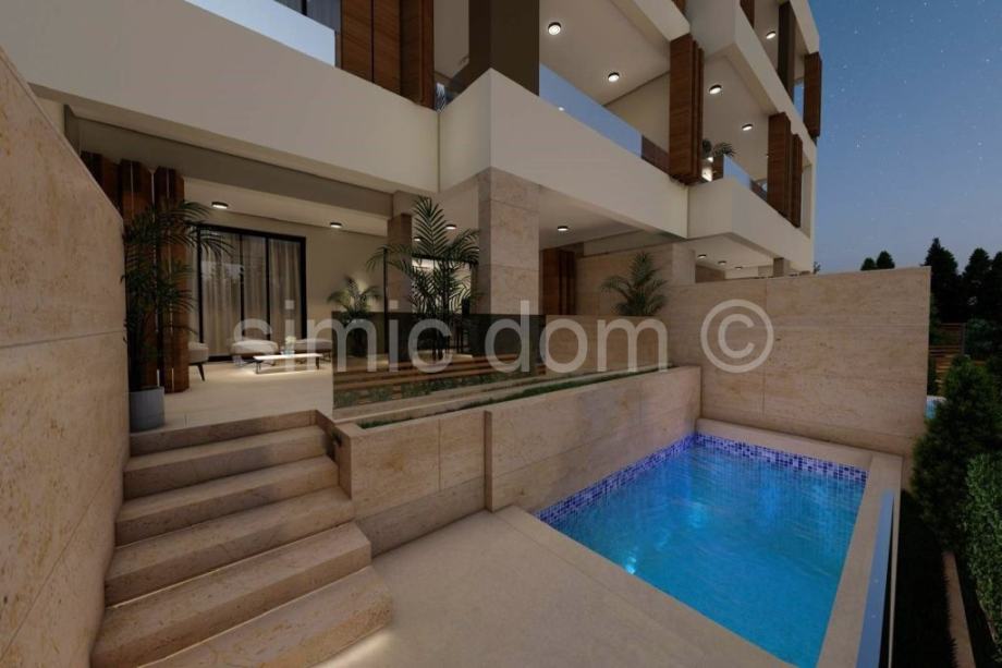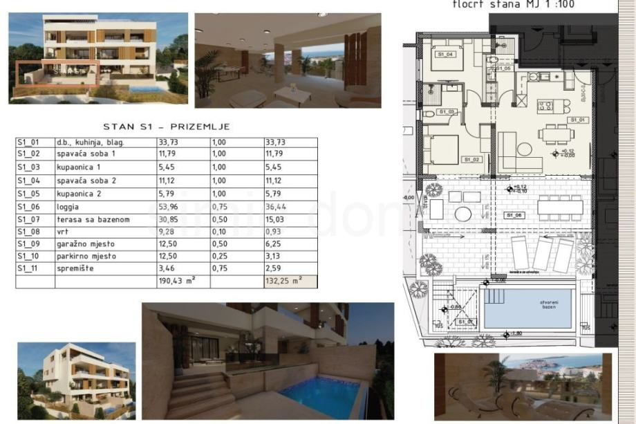 Na prodaju su apartmani smješteni u manjoj zgradi odličnog dizajna, idealnog spoja moderne arhitekture i tradicionalnih materijala. Zgrada se nalazi u mirnoj ulici, a udaljena je svega 450m od mora i centra Primoštena. Iz svakog apartmana zgrade protezat će se odličan pogled na prelijepu okolinu i more. Apartman S1 nalazi se u povišenom prizemlju te zajedno sa svim pripadcima ima neto korisnu površinu od 132m2. Unutarnja površina samog apartmana iznosi 68m2, a osim toga broji i prostranu lođu podne površine 54m2. Sastoji se od 2 spavaće sobe, 2 kupaonice, dnevnog dijela otvorenog koncepta s kuhinjom i blagovaonicom, lođe, a pripada mu i vrt s popločenom terasom uz bazen, 2 parkirna mjesta, od kojih je jedno garažno te spremište. U izgradnji i opremanju koristit će se najkvalitetniji materijali i oprema. U zgradi će se nalaziti lift, a svi apartmani će biti opremljeni vrhunskom aluminijskom stolarijom s električnim podizačima roleta te podnim grijanjem s dizalicom topline. Stropovi će biti spušteni s ugrađenim stropnim klimama te će biti postavljene staklene ograde na terasama, vrhunska keramika i parket, kao i sanitarije u kupaonicama. Zbog pomno planiranih detalja, vrhunske lokacije i modernog dizajna ova nekretnina može potencijalnim kupcima pružati ugodan i miran dom, kao i vrhunsku investiciju u turistički iznimno atraktivnom Primoštenu.