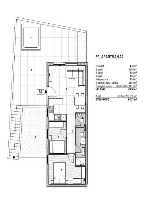 Na prodaju je dvosoban apartman smješten u modernom kompleksu zgrada, svega 150m od plaže na Čiovu. Iz cijelog kompleksa pruža se predivan pogled na more. Apartman A1 nalazi se u prizemlju i neto je korisne površine 65,27 m2, odnosno bruto površine 117,61 m2. Sastoji se od hodnika, dvije spavaće sobe, WC-a, kupaonice, dnevnog boravka, blagovaonice, kuhinje, prostrane terase i vrta. Apartmanu pripada jedno vanjsko parkirno mjesto uz mogućnost kupovine dodatnog parkirnog mjesta. Izgradnja i oprema unutar apartmana je izrazito kvalitetnog standarda, a investitor nudi i uslugu opremanja apartmana i unutarnjeg uređenja prema najvišim standardima, s modernim dizajnom koji zadovoljava potrebe kupaca, ali i uslugu rukovođenja najma apartmana. Investiranje s garantiranim povratom predstavlja ključnu prednost ovog projekta. Investitor nudi mogućnost iznajmljivanja kupljenih apartmana u turističke svrhe, preuzimajući kompletan menadžment i usluge gostoprimstva. Na taj način, vlasnicima je osiguran povrat investicije bez potrebe za angažmanom na operativnim poslovima, jer se sve obavlja u njihovo ime, čime im se omogućuje siguran prihod od turističkog najma. Ovakav projekt je jedan od prvih ovog tipa na tom području, a slični koncepti uspješno se primjenjuju širom svijeta te ovo naselje predstavlja jedinstvenu investicijsku priliku na atraktivnoj lokaciji s velikim potencijalom za generiranje prihoda od turističkog najma i dugoročnu vrijednost nekretnine.