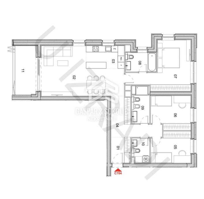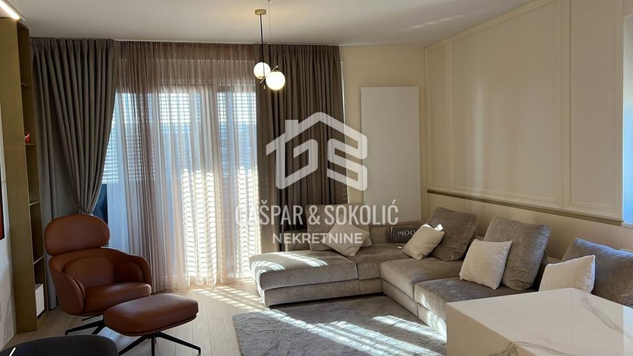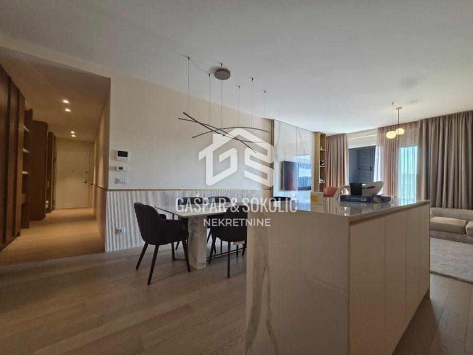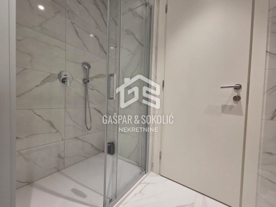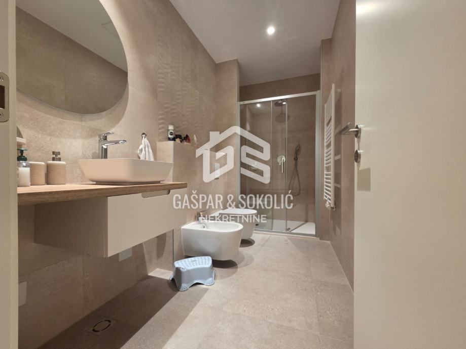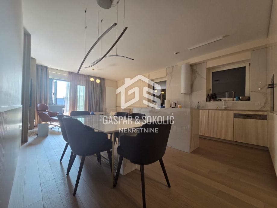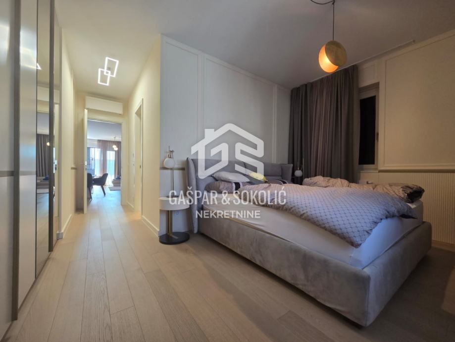 Stan se sastoji od ulaznog prostora koji vodi u prostrani dnevni boravak s blagovaonicom. Ovaj prostor je savršeno osmišljen za obiteljska okupljanja i opuštanje, a velike staklene površine omogućuju obilje prirodne svjetlosti, čineći prostor svijetlim i zračnim. Kuhinja je odlično povezana s blagovaonicom, stvarajući otvoreni prostor za kuhanje i uživanje u zajedničkim obrocima. U stanu su tri spavaće sobe, od kojih jedna ima vlastitu kupaonicu, što omogućava privatnost i udobnost za vlasnike, dok preostale dvije spavaće sobe dijele drugu kupaonicu koja je moderno uređena i opremljena visokokvalitetnim sanitarijama. Dodatni WC nalazi se izvan spavaćih prostorija, pružajući praktičnost i udobnost za sve ukućane i goste. Stan također uključuje loggiu, idealnu za uživanje u svježem zraku ili kao prostor za odmor nakon napornog dana.