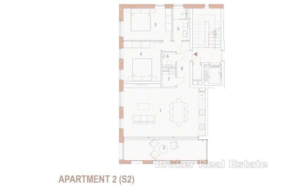 Ukupna površina stana iznosi 75 m², a osmišljen je tako da svaki kutak bude maksimalno iskorišten. Na samom ulazu nalazi se hodnik koji vodi prema praonici uz koju je smješten i odvojeni toalet i prema moderno uređenoj kupaonici. Dvije spavaće sobe nude dovoljno prostora za ugodan boravak i odmor, dok je središnji dio stana otvoreni koncept kuhinje, blagovaonice i dnevnog boravka. Ovaj prostor je svijetao i prozračan te nudi izravan izlaz na prostranu lođu površine 15 m², s koje se pruža očaravajući pogled na more – idealno mjesto za opuštanje i druženje.