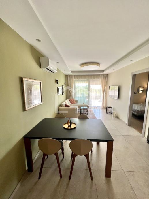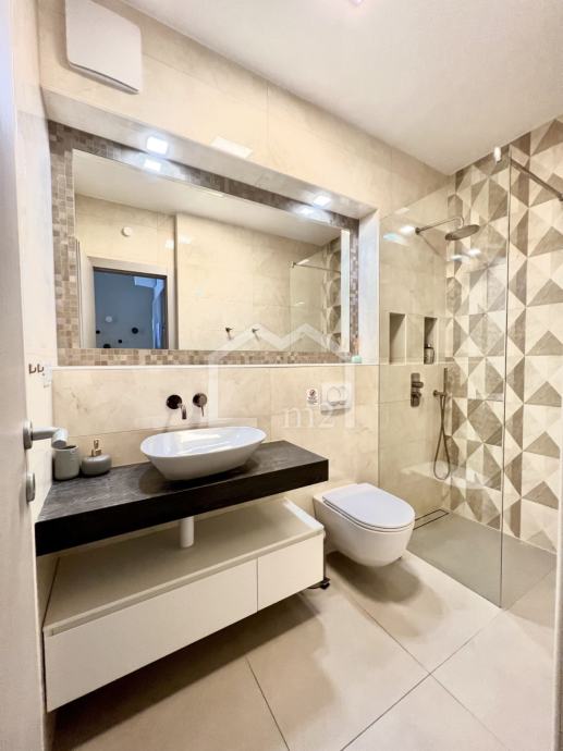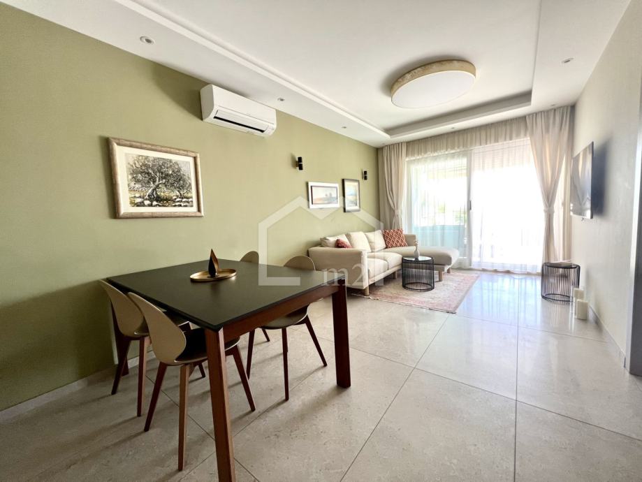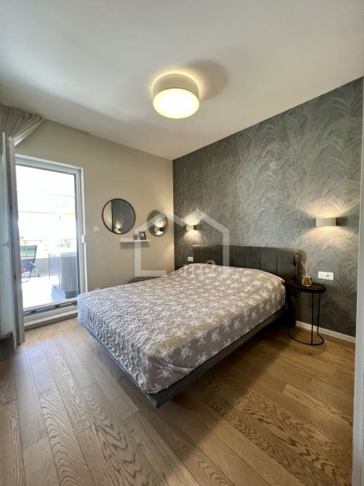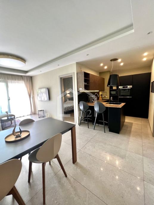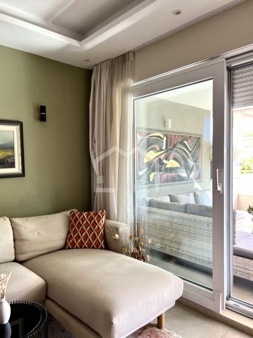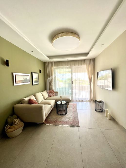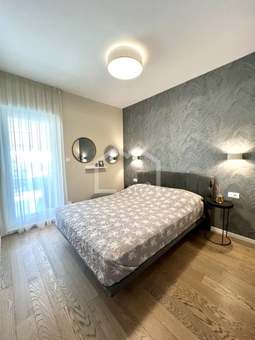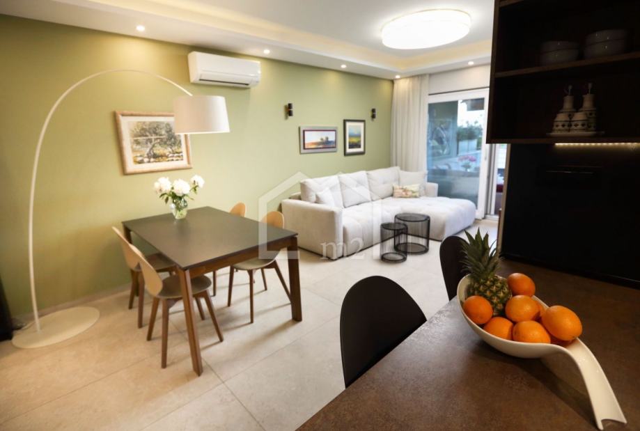 Posredujemo u prodaji modernog, dvosobnog stana na odličnoj lokaciji, u blizini plaže a opet u mirnom okruženju. Smješten je u prizemlju manje stambene zgrade sa liftom, jugo-zapadne orijentacije. Zgrada je jako kvalitetno građena a posjeduje pristup za invalide, kompletan video nadzor, rampu na ulazu u dvorište, uređenu okućnicu bogatu zelenilom koja se stalno održava.