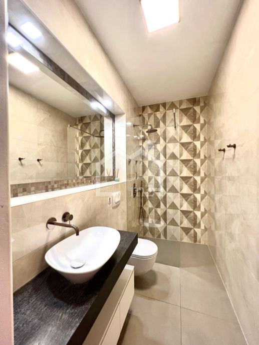 Površina zatvorenog dijela stana (dvije sobe,kupaonica, kuhinja, hodnik i dnevni boravak) je 53,94 m2. Površina vanjskog dijela (lođa i vrt) je 25,50 m2. Što je ukupno 79,44 m2 stambene površine. Sastoji se od ulaznog dijela, dvije spavaće sobe, kuhinje s blagavaonicom, dnevnog boravka, kupaonice i velike lođe na kojoj je smješten jacuzzy a sa koje se pruža pogled na more i vrt.