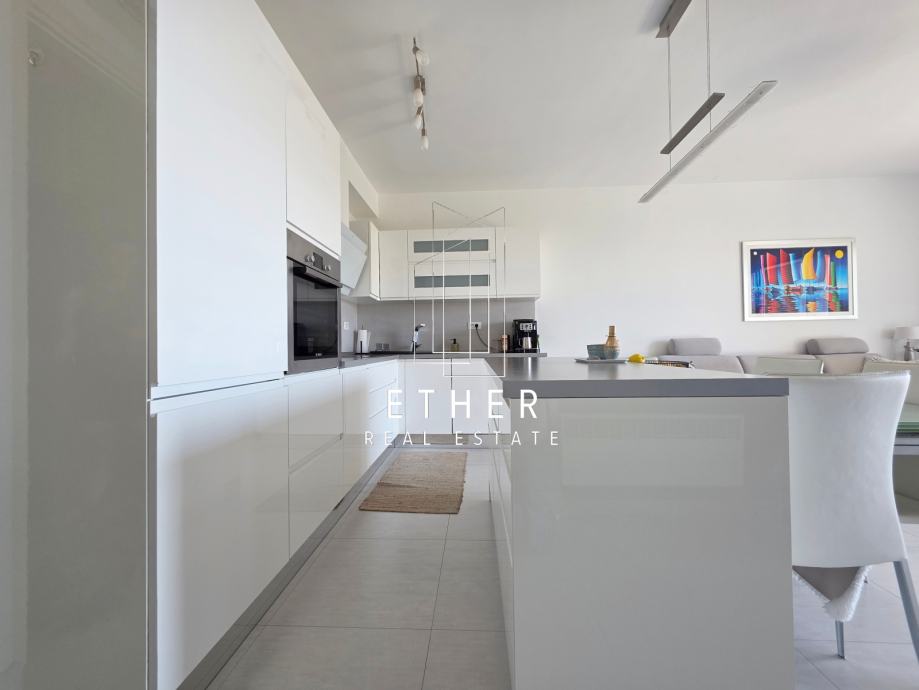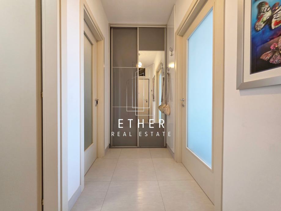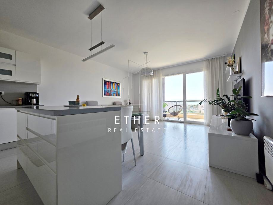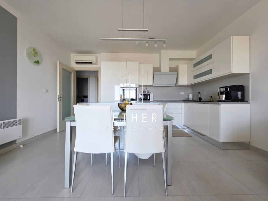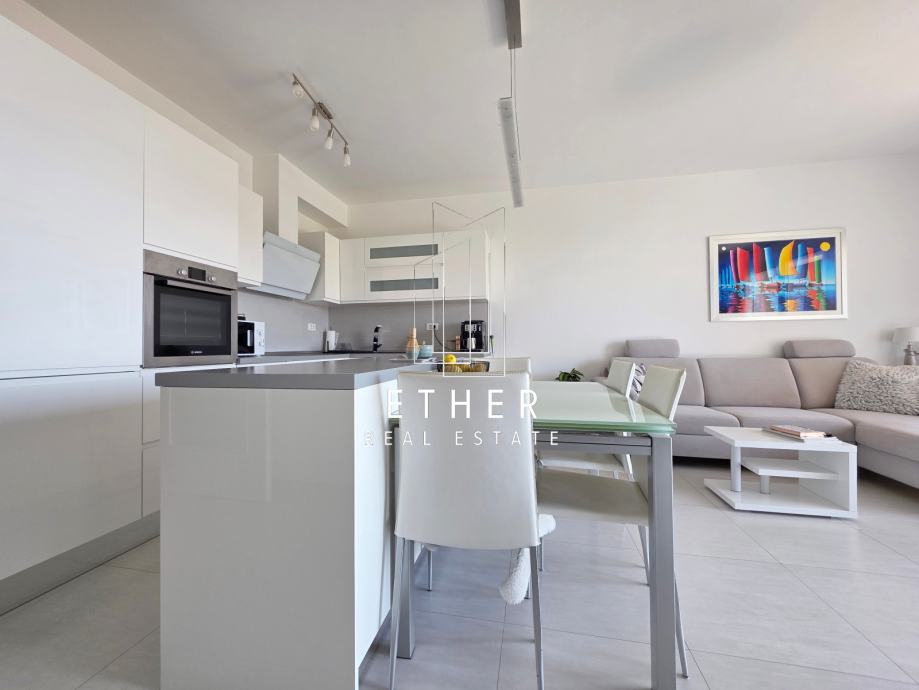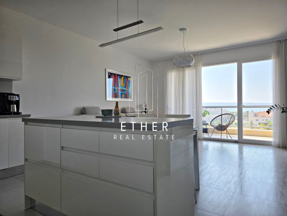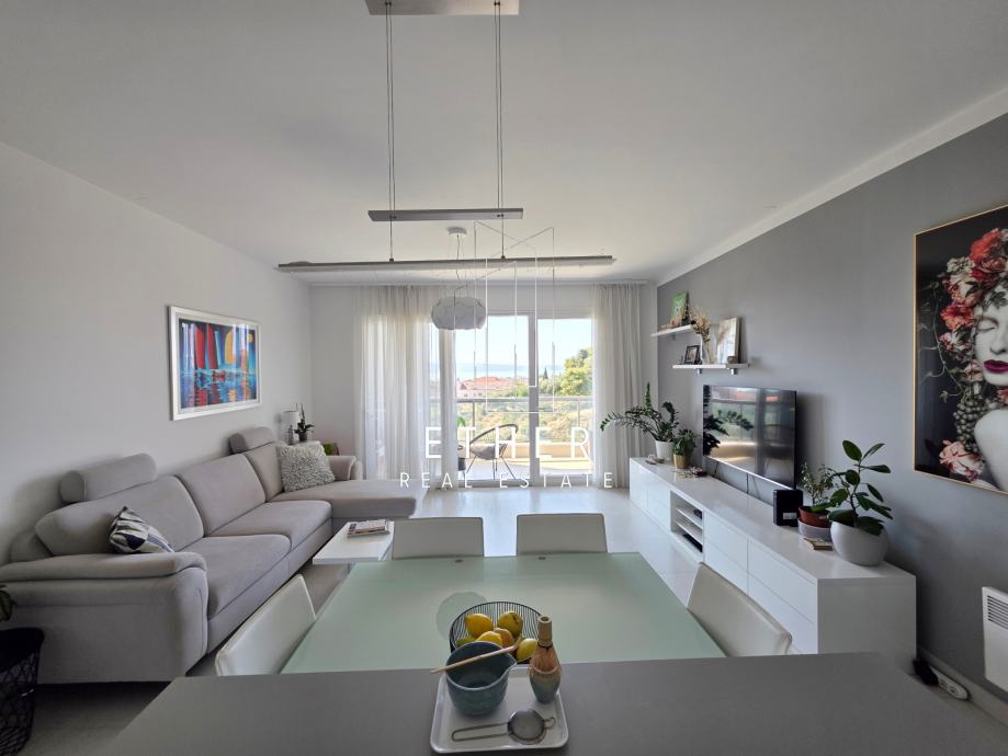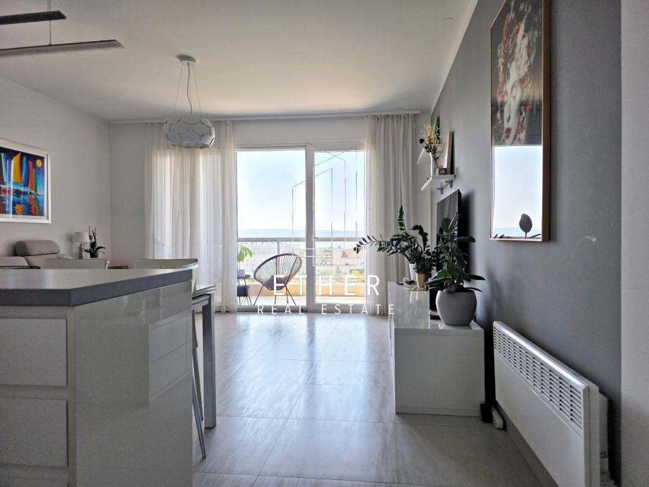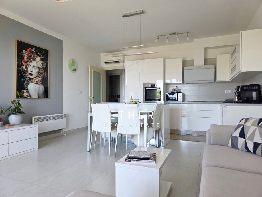It consists of an entrance area, kitchen with dining room and living area, two bedrooms, bathroom, small toilet and loggia with a view of the sea.
