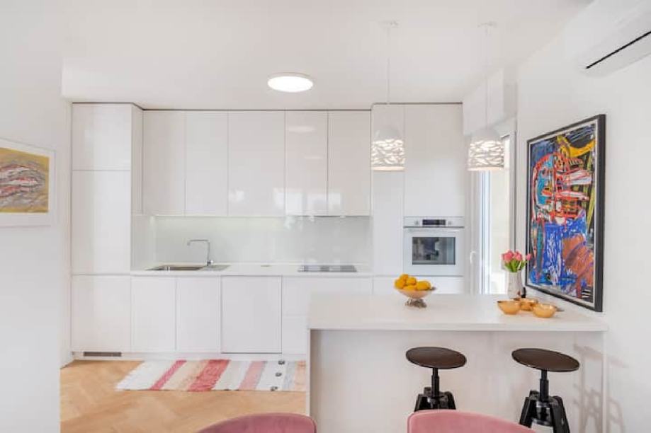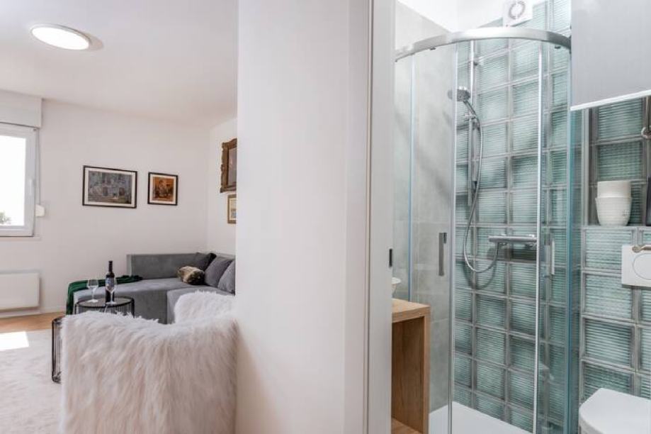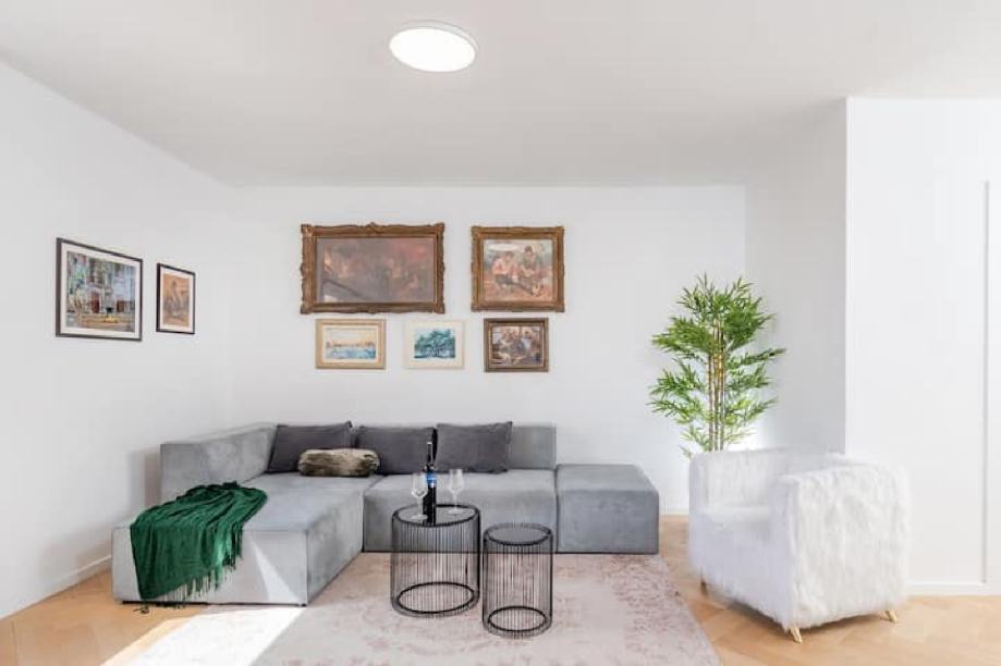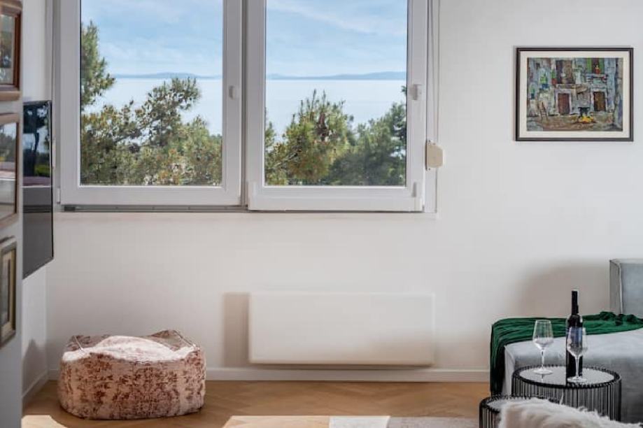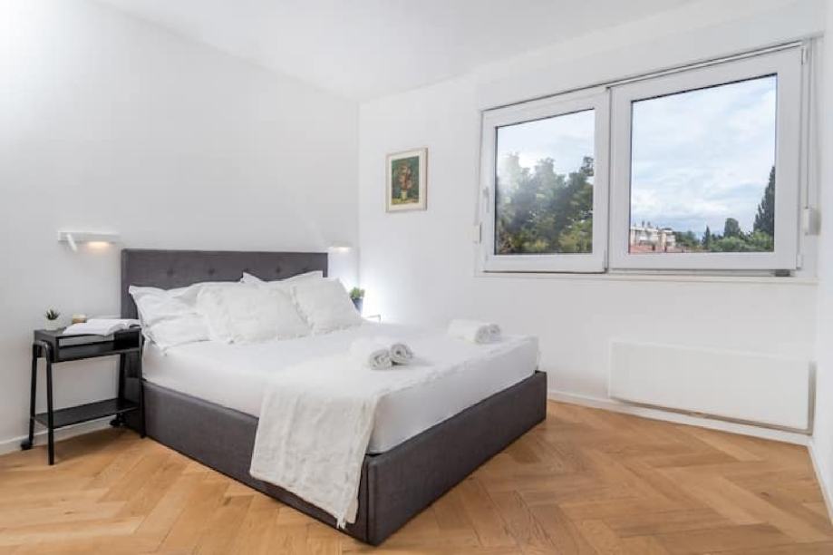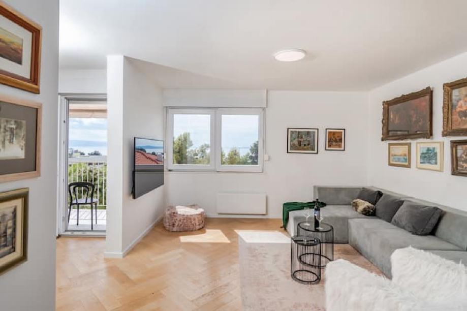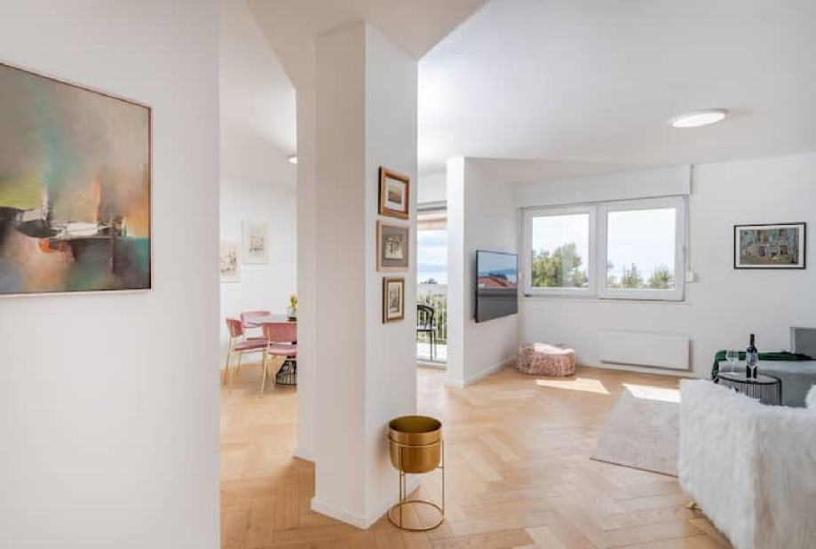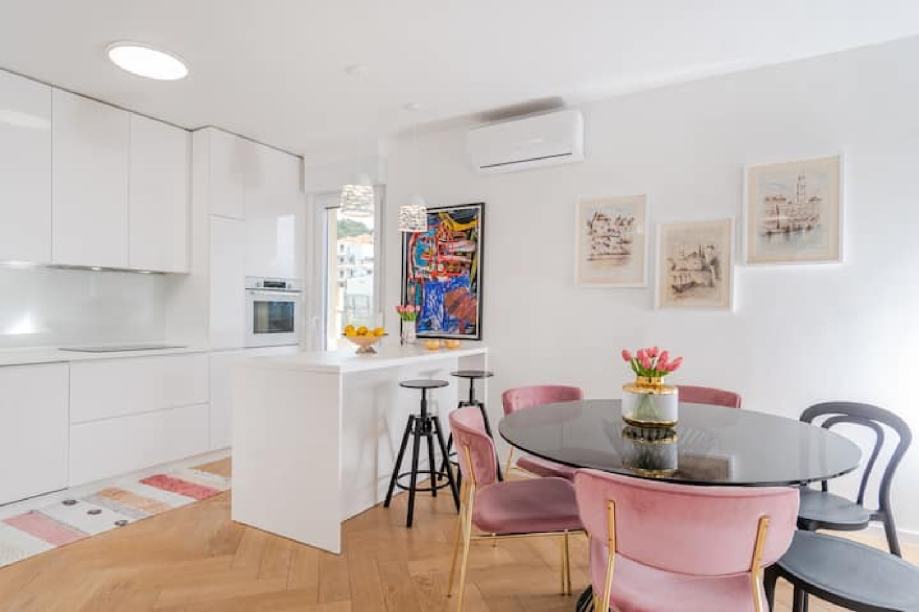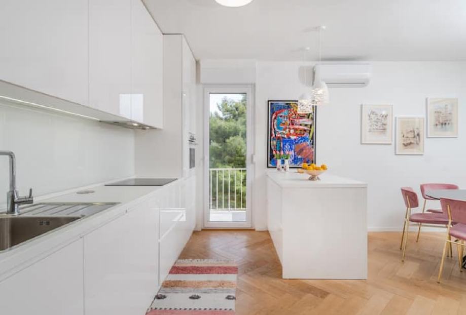 For rent is a beautiful modern comfortable two-bedroom apartment with a beautiful view. It is located in one of the most beautiful parts of Split - Meje. It has 87m2, and consists of two bedrooms, two bathrooms, kitchen with dining area, living room and 8m2 balcony with a beautiful view of the sea, islands and green pine trees. The apartment is newly renovated, air-conditioned, south-facing, always sunny and warm. The ferry port, the main bus and train station are a 15-minute walk from the apartment, only 150 m from the apartment is the sea and the beach and a 12-15-minute easy walk along the promenade along the sea and the ACI marina you are in the center of Split (old town and Riva).