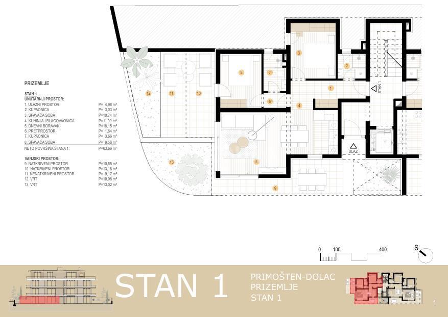 U ponudi je dvosoban stan smješten u prizemlju moderne novogradnje u Primoštenu, predio Dolac. Stan ima neto stambenu površinu 63,66 m² te dodatnu vrijednost kroz više vanjskih prostora – natkrivene terase, nenatkrivenu terasu i vrt, što omogućuje ugodan boravak na otvorenom i osjećaj privatnosti.