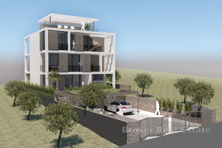 U sklopu novoizgrađene apartmanske kuće, smještene na atraktivnoj lokaciji iznad Primoštena, prodaje se prekrasan dvosoban stan.