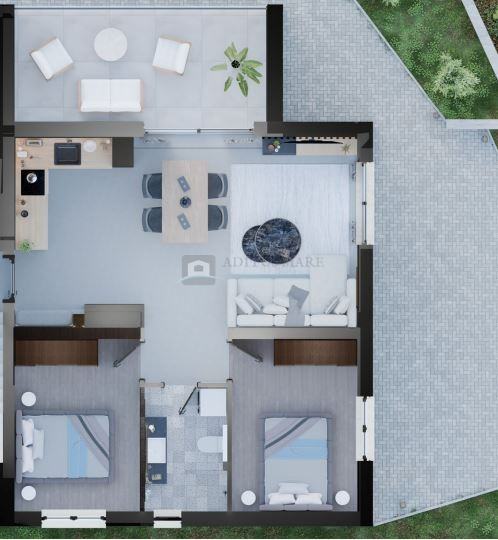 Stan je projektiran s naglaskom na udobnost i maksimalno iskorištavanje prostora. Otvoreni dnevni prostor povezuje kuhinju i dnevni boravak te obiluje prirodnim svjetlom, uz izravan izlaz na privatnu lođu koja pruža ugodan prostor za opuštanje.