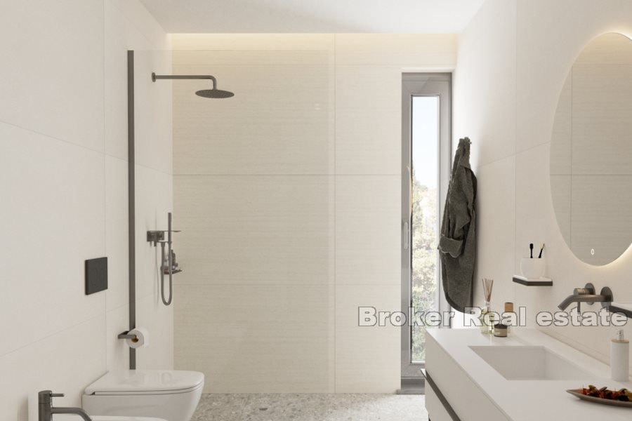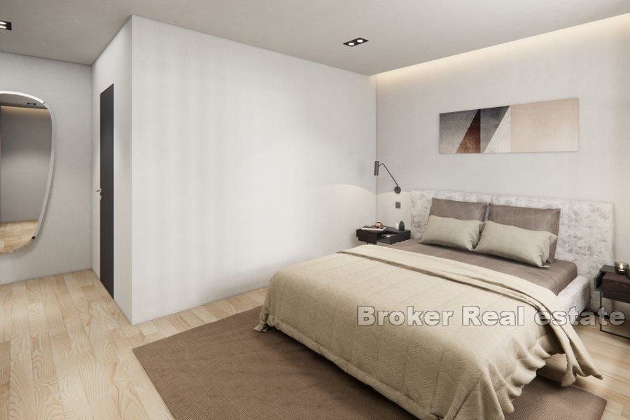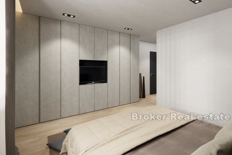 Sastoji se od prostranog i otvorenog dnevnog dijela sa kuhinjom, blagovaonom i boravkom od 39 m2 sa izlazom na terasu od 16 m2. Hodnikom su redom raspoređeni ostava, odvojeni sanitarni čvor, dvije spavaće sobe od kojih jedna ima kupaonicu te zasebna kupaonica. Stepenicama se ide u potkrovlje u kojem se nalaze spavaća soba sa kupaonicom, wellness prostorija sa saunom i jaccuzijem te terasa od 20,5 m2 sa koje se pruža prekrasan otvoren pogled na more i grad.