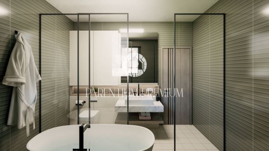 Penthouse se sastoji od otvorenog dnevnog boravka, kuhinje i blagovaonice okruženog velikim staklenim stijenama povezanim sa 2 terase od kojih jedna ima jacuzzi te nesmetani pogled na more. U ovome luksuznom stanu se nalaze 3 spavaće sobe sa vlastitim kupaonicama i terasama sa kojih se pruža umirujući pogled na grad i more. Bogati sadržaj ovoga stana nudi još dodatni toalet, praonicu, spremište i elegantni hodnik koji to sve povezuje.