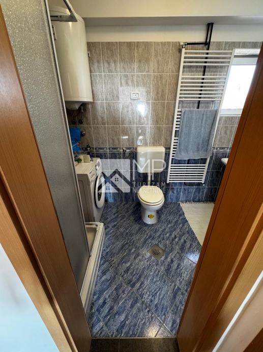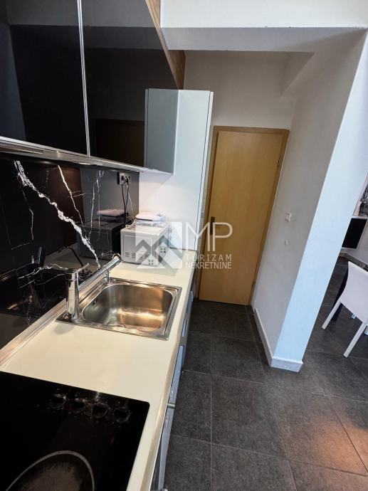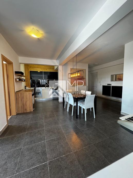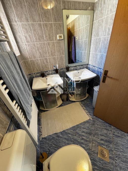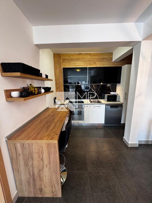 Stan je potpuno namješten ručno izrađenim namještajem visoke kvalitete, dok keramičke pločice kroz cijeli prostor olakšavaju održavanje i daju elegantan, moderan izgled. Veliki prozori s aluminijskom stolarijom i roletnama osiguravaju obilje prirodnog svjetla tijekom cijelog dana, a moderna rasvjeta dodatno naglašava dojam svježine i prozračnosti. Klima uređaj i centralno grijanje na struju pružaju maksimalnu udobnost tijekom cijele godine.