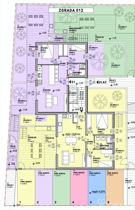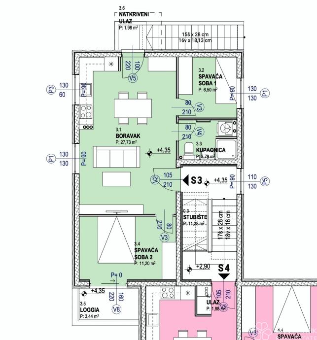 Stan S3 - 1. kat - stambena površina 49,22 m2 (2 spavaće sobe + kupaonica) + lodja (3,44 m2) + dvorište i terasa u prizemlju s vanjskim bazenom 3x7m (72,67 m2) + vanjsko parking mjesto PM3, ukupna neto površina 66,08 m2 = 285.000 EUR (cijena s uključenim PDV-om)