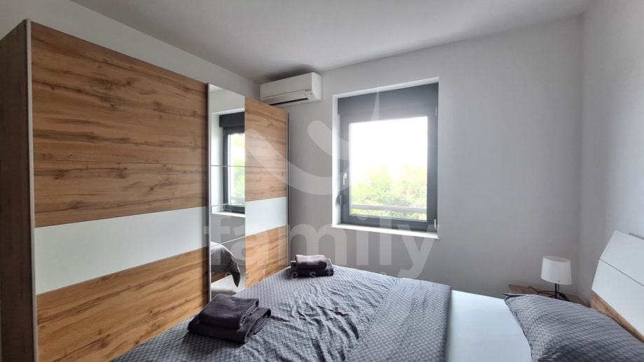 Upravo u Pješčanoj Uvali, jednom od luskuznijih naselja u sklopu općine Medulin nalazi se navedeni stan sveukupne površine 103 m2. Stan je smješten na drugom katu stambene zgrade sa ukupno 24 stambene jedinice te se isti proteže na dvije etaže. Prizemlje se sastoji od ulaznog predprostora, osvijetljenog dnevnog boravka, visokokvalitetne kuhinje i prostorom za ručavanje sa izlazom na balkon, spremišta, kupatila s walk-in tušem kao i spavaće sobe. Na drugu etažu navedene nekretnine nas vodi spiralno stepenište te se ista sastoji od jedne spavaće sobe u kojoj je pod obložen laminatom dok je u ostatku stana postavljena visokokvalitetna keramika. Svaka spavaća soba je također opremljena jedinicom Mitsubishi klima uređajem dok je u kupatilu postavljeno podno grijanje. U cijeloj nekretnini je postavljena visokokvalitetna PVC stolarija antracit boje s duplim staklima što osigurava zvučnu i toplotnu izolaciju te su postavljeni VELUX krovni prozori s zastorima za zatamnjivanje. Zgrada također posjeduje lift što olakšava svakodnevni život te je osigurano jedno garažno parkirno mjesto. Brojila struje i vode su odvojena.