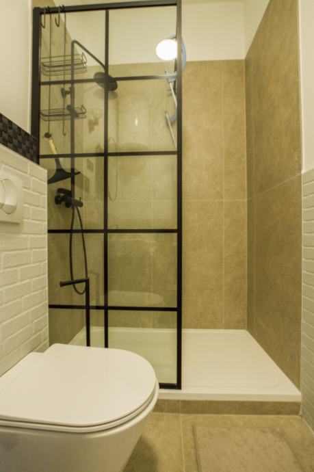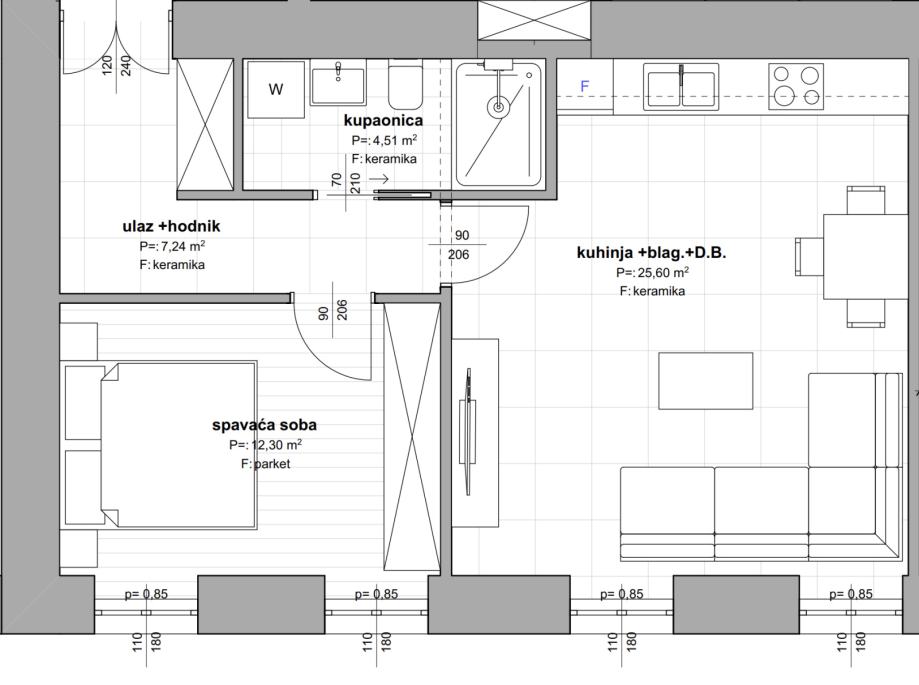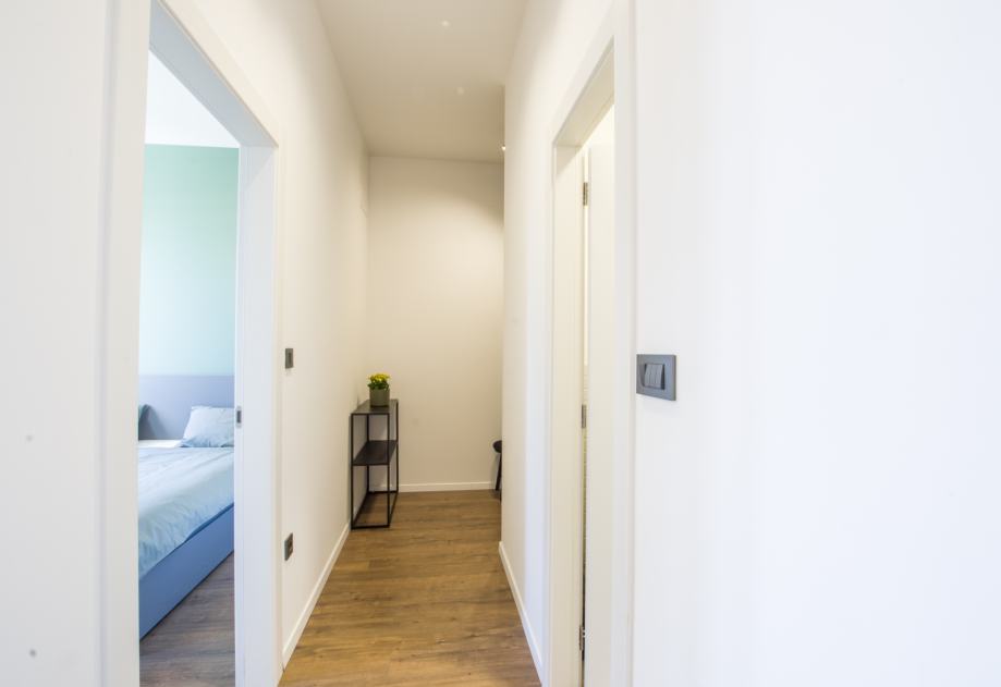 STAN SE SASTOJI od ulaznog prostora s ugradbenim garderobnim ormarom, atraktivne kuhinje, klimatiziranog, moderno dizajniranog dnevnog boravka s blagovaonicom u jednoj funkcionalnoj cjelini s komodom i radnim stolom sa stolicom, spavaće sobe s bračnim ležajem, kupaonice s tuš kabinom i WC-om.