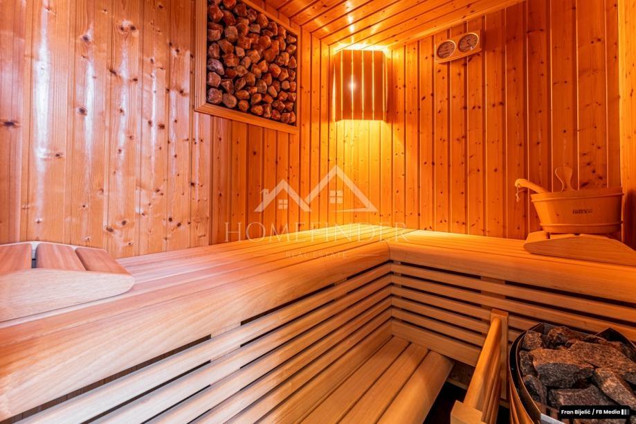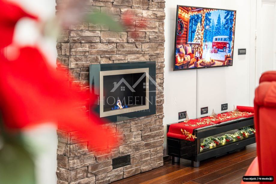 Stan je opremljen vrhunskom kuhinjom marke Scavolini s Bosch ugradbenim aparatima, dok dnevni boravak krasi trosjed i masažna fotelja renomiranih proizvođača Natuzzi i Keyton. U prostoru se nalazi i kamin, a dodatni ugođaj pružaju dizajnerska rasvjeta i visokokvalitetni prekidači i utičnice Vimar. Podovi su izrađeni od pažljivo biranih materijala koji kombiniraju estetiku i funkcionalnost.