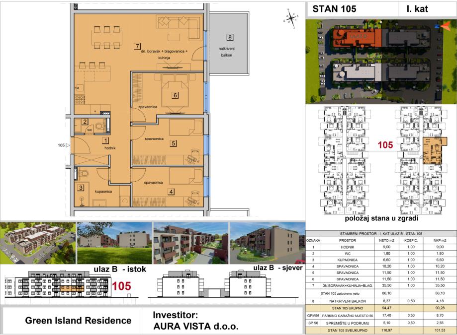 Stan oznake ST-105 nalazi se na 1. katu na ulazu B. Stambena površina stana iznosi 86,10 m2, sadrži natkriveni balkon, jedno garažno parkirno mjesto i spremište u podrumu, te je ukupna netto korisna površina stana 101,53 m2. Tlocrt stana i pregled površina se nalaze u slikama.
