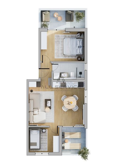 It consists of a hallway, two bedrooms, a spacious living room with a kitchen and dining area, two bathrooms, a covered parking space, an uncovered parking space, a garden, and a paved uncovered terrace, making the total usable area of the apartment 105.93 m².