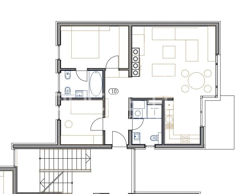 Sastoji se od hodnika, dnevnog boravka, kuhinje, dvije spavaće sobe i dvije kupaonice (ukupne površine 69.36 m2). Stanu pripada terasa, gornje parkirno mjesto, donje parkirno mjesto i spremište u suterenu ukupne površine m2, što čini sveukupnu površinu stana i pripadaka od 103 m2.