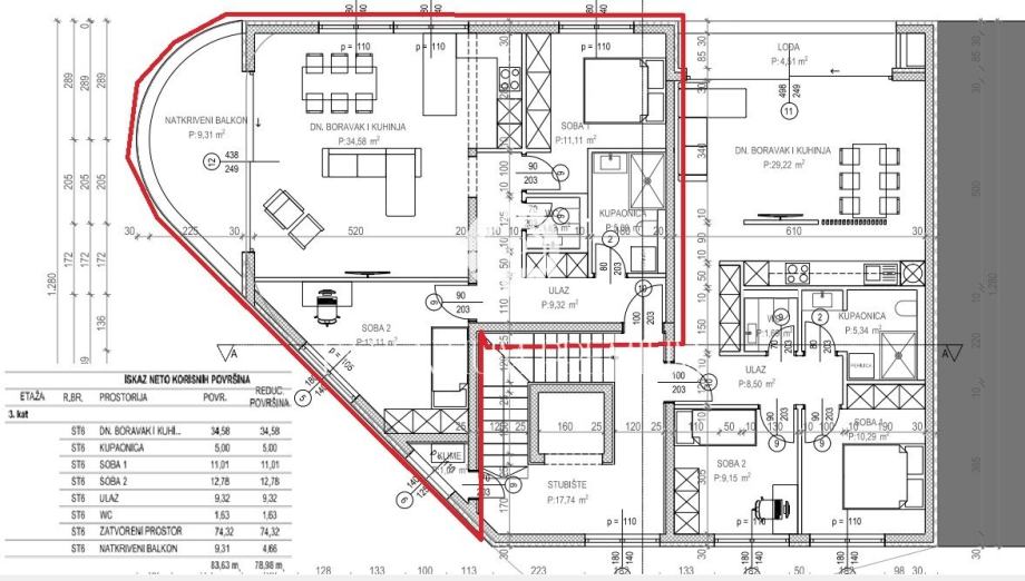 Stan neto površine 78,98 m² sastoji se od ulaznog hodnika, dvije spavaće sobe, svijetlog dnevnog boravka s kuhinjom i blagovaonicom, kupaonice, dodatnog WC-a te natkrivene terase od 9,31 m², s koje se pruža predivan panoramski pogled na more.