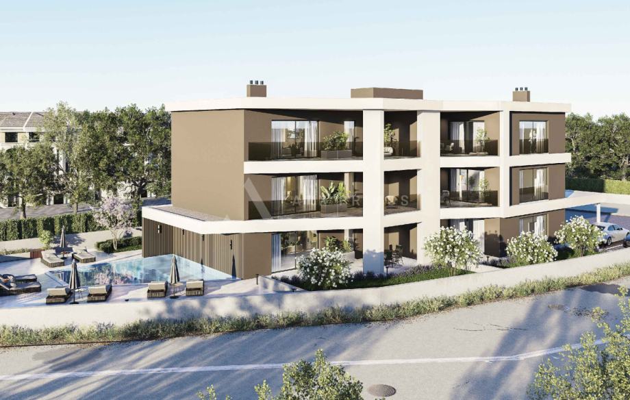 U atraktivnoj i mirnoj zoni Zambratije, u kvalitetnoj novogradnji s bazénom, prodaje se moderan stan smješten na prvom katu, s prekrasnim pogledom na more.