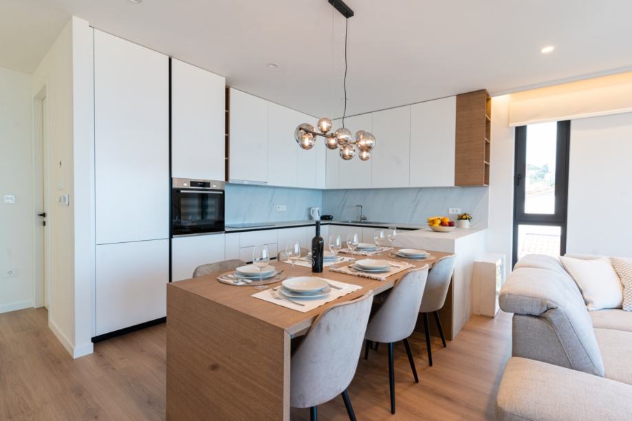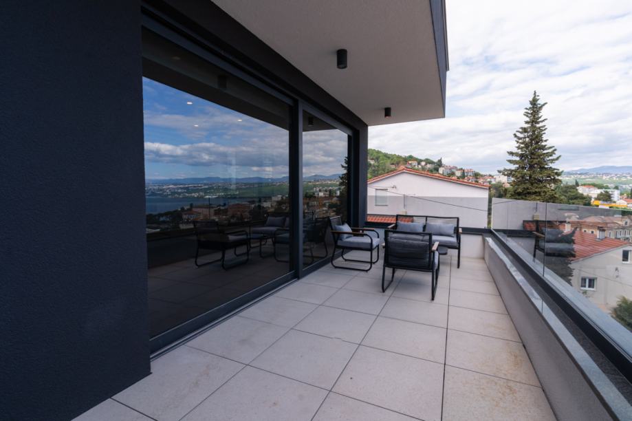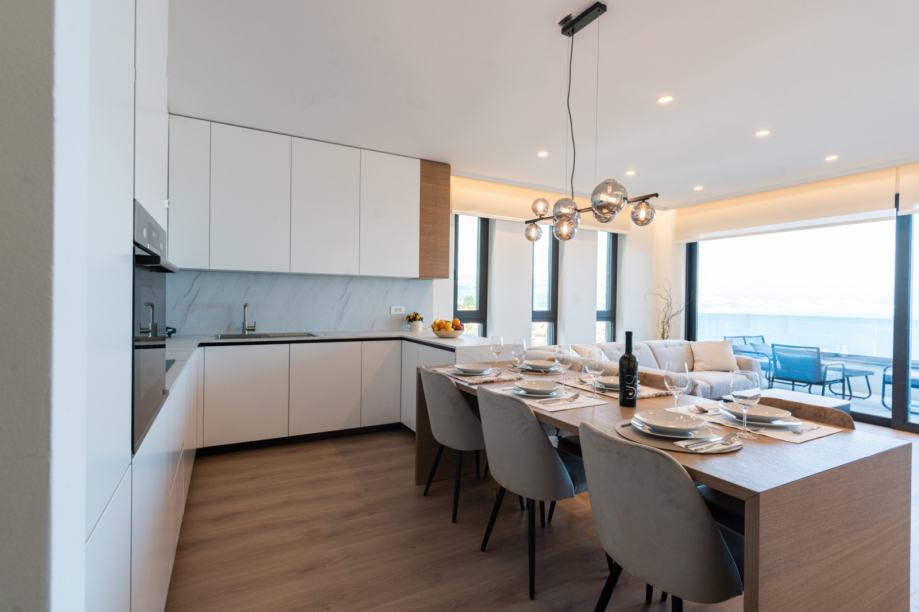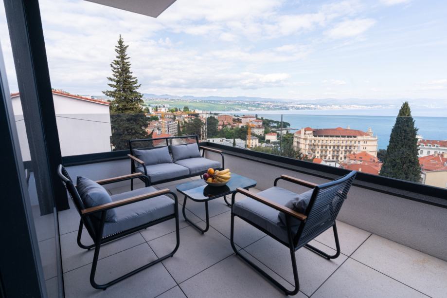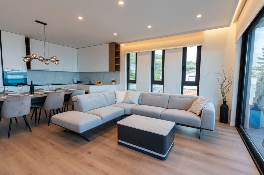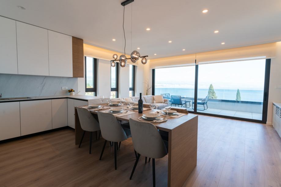Stan impresionira otvorenim konceptom koji objedinjuje kuhinju, blagovaonicu i dnevni boravak. Prekrasna staklena vrata od poda do stropa vode na prostranu terasu s koje se pruža divan pogled na more i Opatiju.