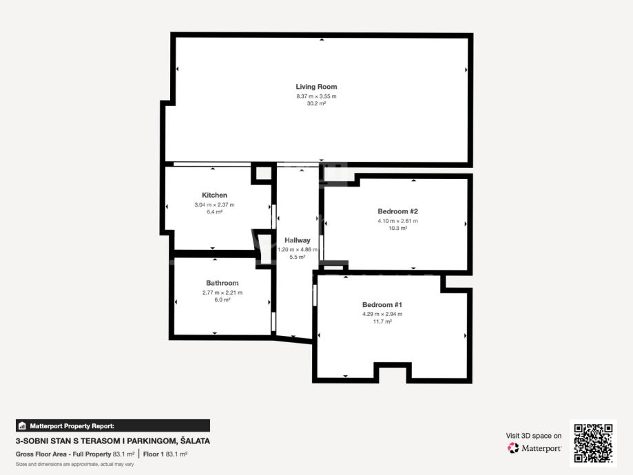 Stan se sastoji od tri sobe, zatim kuhinje, kupaonice s WC-om, hodnika, te prostrane terase koja omogućuje ugodan boravak na otvorenom.