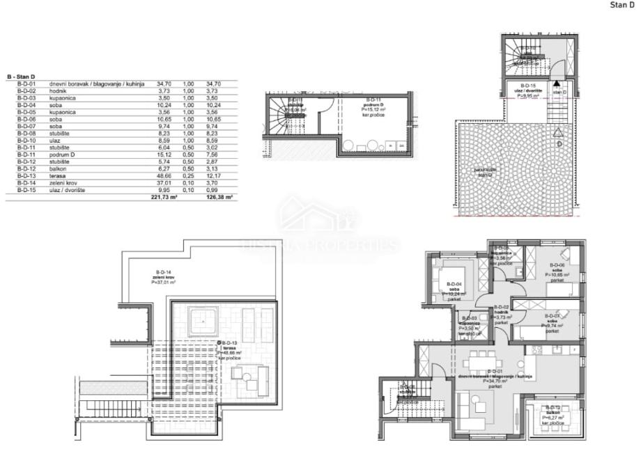 Unutarnjim stubištem penjemo se na krovnu terasu sa svim instalacijama za postavljanje jacuzzija, ljetne kuhinje te pergole za dodatnu zaštitu od Sunca i zelenim pojasom za potpuni prirodni ugođaj na visini.