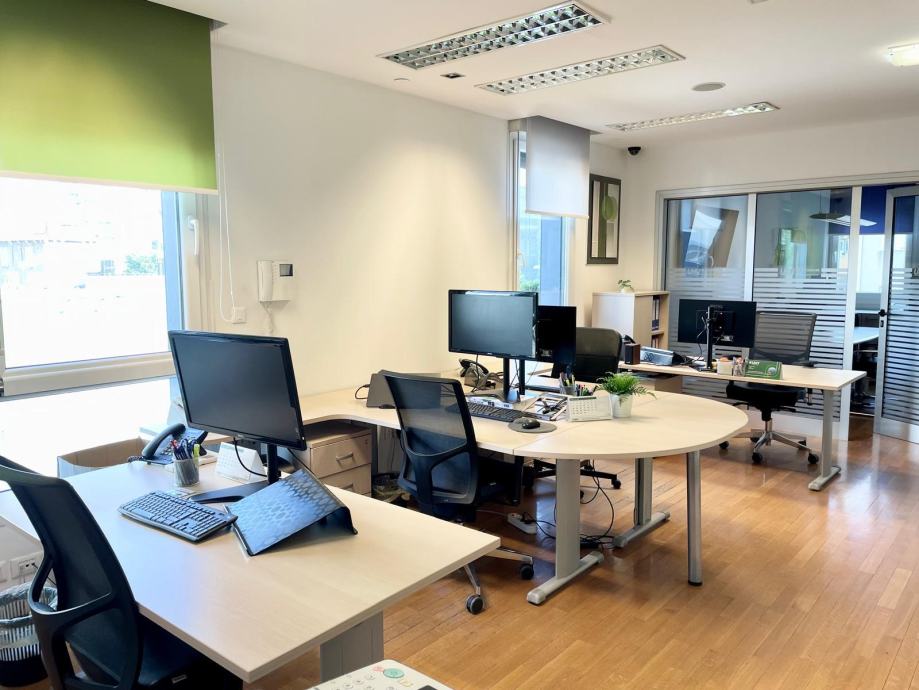 Rent a fully equipped office space on the 1st floor of a business building, Sukoišan district. With an area of 62.10 m², the office consists of: