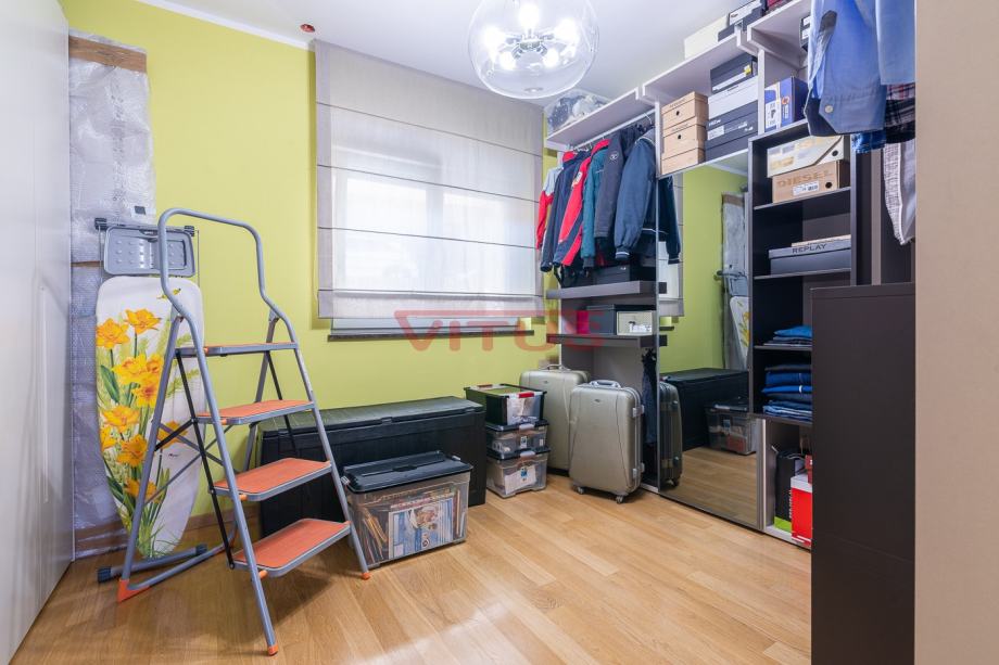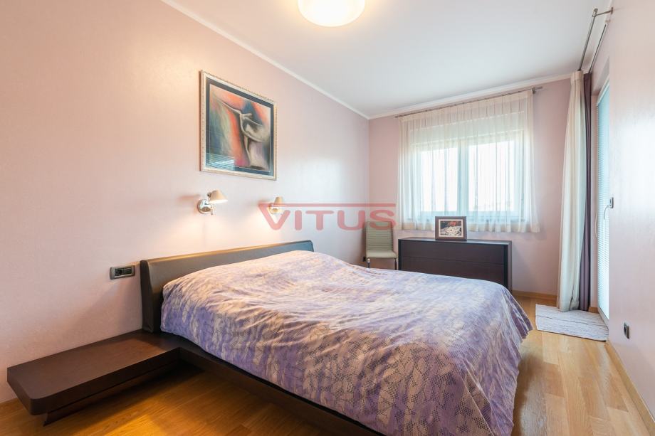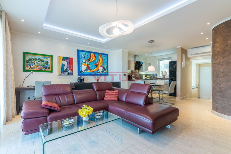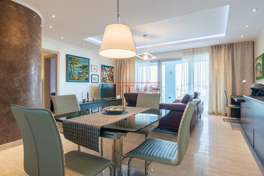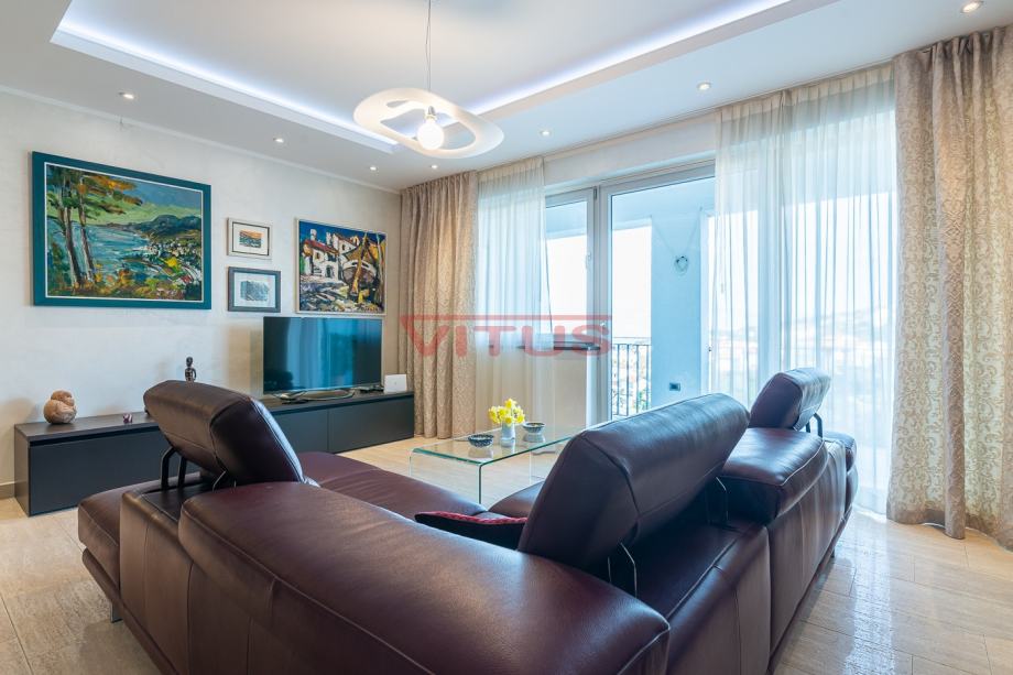 Samo u našoj ponudi! Moderan trosoban stan s otvorenim pogledom na more, ukupne stambene površine 106 m2, nalazi se u prizemlju stambene zgrade izgrađene 2005. godine. Sastoji se od spavaće sobe, radne sobe, garderobe, ostave, hodnika, kupaonice, wc-a, loggie, kuhinje, blagovaonice i dnevnog boravka. Iz loggie se pruža panoramski pogled na more. Stanu pripada jedno parkirno mjesto, drvarnica u suterenu i okućnica od 40 m2. Visoka kvaliteta gradnje i opreme, kvalitetne sanitarije, klimatizirano, PVC stolarija, električno podno grijanje. Stan se prodaje namješten. Udaljen je od mora 700 m.