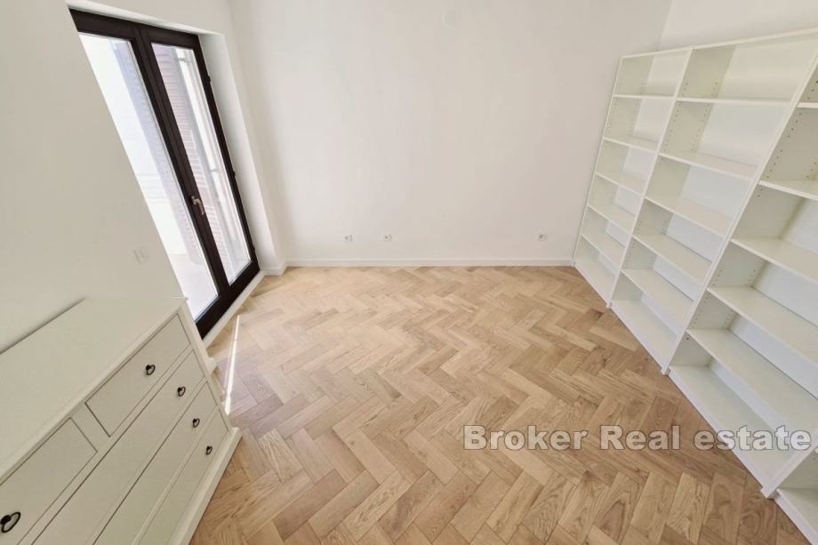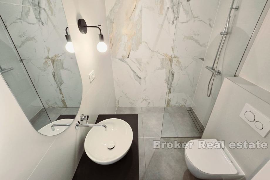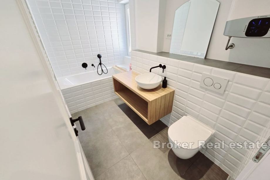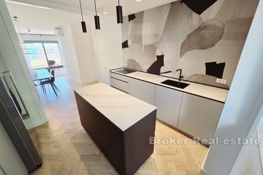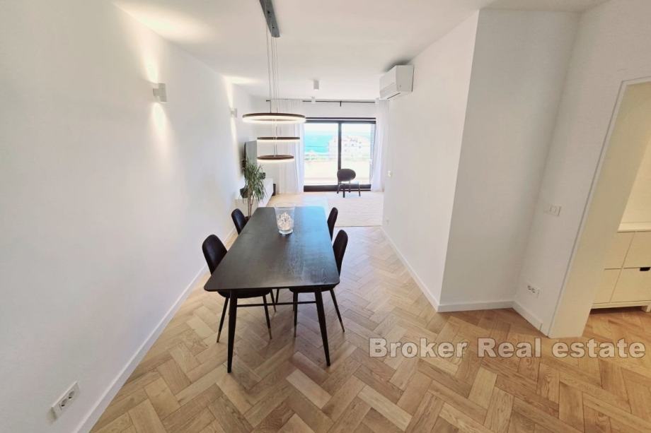Iznajmljuje se dugoročno potpuno namješten i opremljen stan na 1. katu manje zgrade na Žnjanu. Stan je površine 126 m2, orijentiran jug-zapad-sjever, a sastoji se od 3 klimatizirane spavaće sobe, dvije s bračnim krevetima, dok je treća ostavljena na izbor najmoprimcu koju će joj svrhu dati, bilo kao spavaću ili radnu sobu. Glavna spavaća soba ima svoju kupaonicu, dok je druga kupaonica zajednička. Stan se sastoji od kuhinje s blagovaonicom i prostranim, dnevnim boravkom u jedinstvenom prostoru. Stan također posjeduje veliku terasu južne orijentacije s potpunim pogledom na more. Sve tri sobe imaju izlazak na balkon. U slučaju ovog stana, valja napomenuti da se radi o prvom useljenju. Lokacija stana je vrlo mirna, a u blizini su plaže i trgovine. * S obzirom na promjenjivost i dinamiku iznajmljivanja, oglas je informativnog karaktera te ne mora nužno značiti da je ovaj stan dostupan za najam.