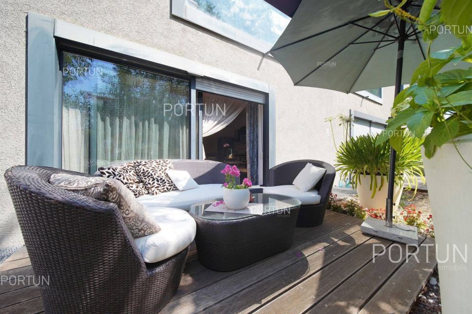 Svijetao i prostran stan u prizemlju novije zgrade krase moderne linije, veliki otvori, ozelenjena terasa, a u cijeni je i parkirno mjesto u podzemnoj etaži. Središnji dio stana je svjetlom okupan jedinstveni prostor dnevnog boravka, opremljene kuhinje i blagovaonice iz kojega se kroz veliku staklenu stijenu izlazi na terasu. Bujnim zelenilom ukrašena terasa popločena je s deckingom i nudi dovoljno prostora za obiteljska druženja pod vedrim nebom. Noćni dio stana sastoji se od dvije spavaće sobe bračnim krevetima te dječje spavaće sobe u kojoj je krevet za jednu osobu. Stan se nalazi u popularnom kvartu udaljenom svega par koraka od škola te može savršeno poslužiti za višečlanu obitelj koja traži moderan i svjetao dom u Rovinju po razumnoj cijeni. KLJUČNE OSOBINE✔ Plaža Mulini 2 km ✔ 5 min. hoda od škole ✔ 3 Spavaće sobe │ 2 Kupaonice │ 6 Ležajeva✔ Jedno obilježeno parkirno mjesto✔ Potpuno opremljeno za iznajmljivanje. ✔ Mirna stambena četvrt