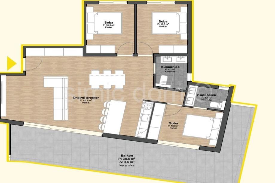 Na prodaju su apartmani u novogradnji svega par koraka od mora u mirnom naselju blizu Rogoznice. Zgradu gradi renomirana firma s velikim iskustvom u novogradnjama, stoga su kupci oslobođeni poreza na promet nekretninama. Apartman S3 smješten je na prvom katu zgrade te ima neto korisnu površinu od94,34 m2, odnosno korisne podne površine 123,21 m2. Sastoji se od tri spavaće sobe, dvije kupaonice, prostranog dnevnog dijela s kuhinjom i blagovaonicom, iz kojeg se izlazi na predivnu terase s pogledom na more. Apartmanu pripada i vanjsko parkirno mjesto uključeno u cijenu. Svaki apartman opremljen je s pažnjom i prema visokim standardima gradnje. U pogledu opreme, odabrani su renomirani proizvođači koji jamče dugotrajnost, funkcionalnost i estetiku. Ugrađuje se aluminijska vanjska stolarija Schüco, dok je fasada izvedena s toplinskom izolacijom od vune. Grijanje i hlađenje osigurano je DAIKIN klimatizacijskim uređajima, a u kupaonicama je predviđeno podno grijanje. U ovoj fazi izgradnje, prema želji kupca, moguće je uvesti podno grijanje u cijelom stanu. Podovi su obloženi hrastovim parketom i keramikom više klase, a kupaonska oprema uključuje sanitarije provjerenih proizvođača Hans Grohe i Geberit. Udaljenost do mora i marine iznosi svega 30 metara, a prva uređena plaža udaljena je svega 80m što čini ovu nekretninu izrazito atraktivnom. Očekivano useljenje je ljeto 2027. godine.